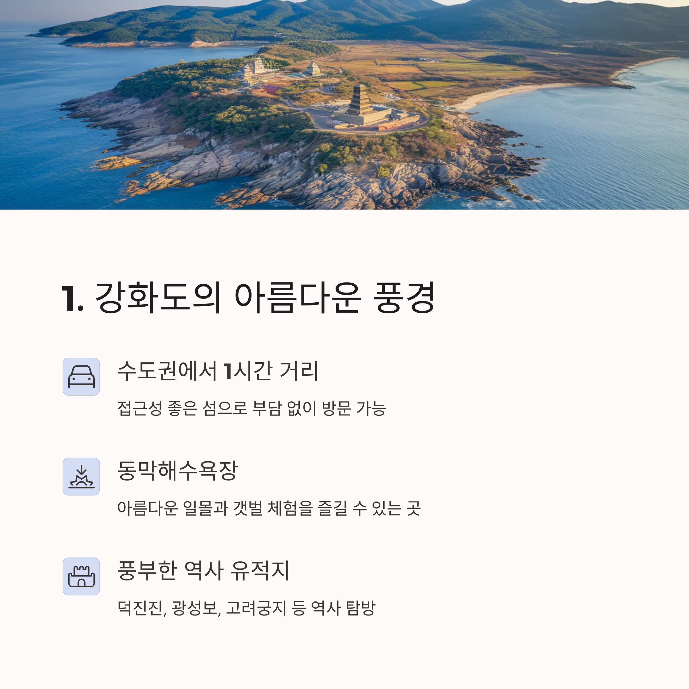 첫 번째로 소개할 곳은 강화도입니다. 서울에서 차로 1시간 정도면 도착하는 거리라 주말 나들이로 부담이 적습니다. 동막해수욕장에서는 아이들과 함께 갯벌 체험을 할 수 있고, 해 질 녘 바다 풍경은 감탄이 절로 나올 정도로 아름답습니다.