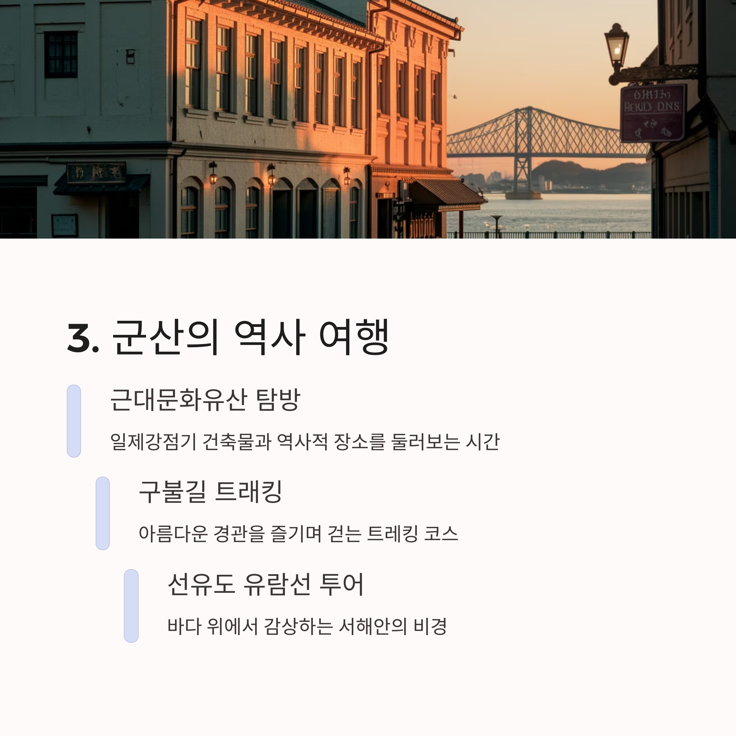 마지막 추천지는 군산입니다. 군산은 도심 감성과 근대문화가 공존하는 독특한 매력을 가졌습니다. 잘 정비된 구불길을 따라 산책하며 근대문화유산을 아이들과 함께 탐방할 수 있습니다. 트래킹 프로그램이나 스탬프 투어도 준비되어 있어 온 가족이 함께 참여할 수 있는 점이 장점입니다.