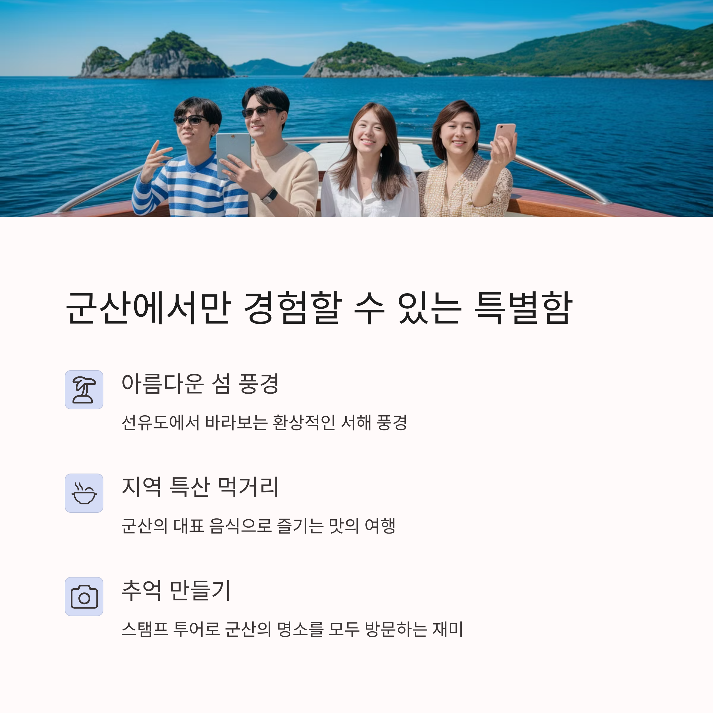 선유도 유람선 투어를 통해 섬 풍경을 가까이에서 감상할 수 있고 군산의 대표 맛집인 이성당 단팥빵, 해물 요리 등 남녀노소 누구나 즐길 수 있는 먹거리도 풍부합니다. 도시 감성과 자연 풍경을 동시에 느끼고 싶은 가족에게 추천드립니다.