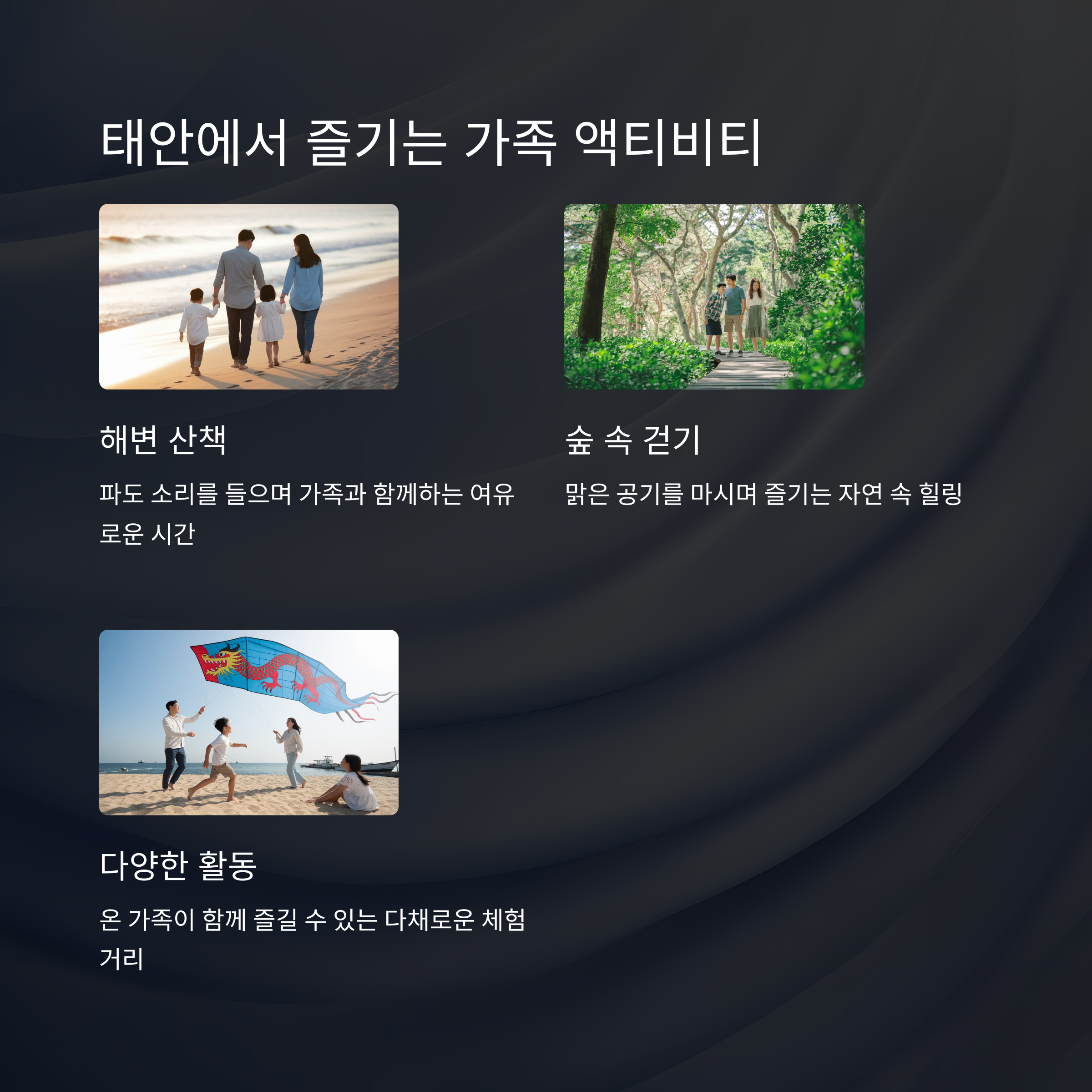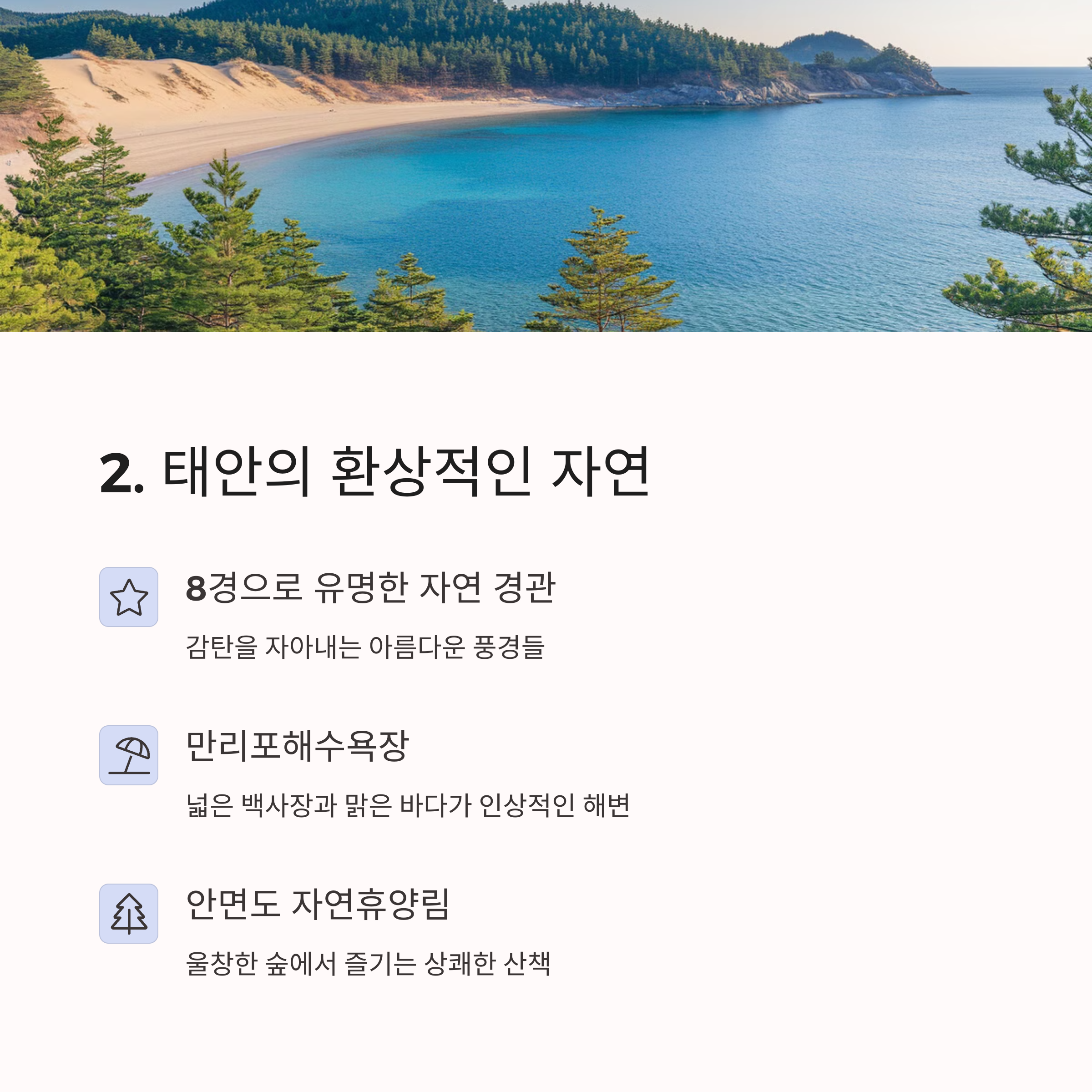 다음은 자연이 살아 숨 쉬는 태안입니다. 만리포해수욕장에서의 산책은 그야말로 힐링의 시간이 되며 날씨가 맑은 날에는 일몰의 절경을 감상할 수 있습니다. 봄에는 꽃 축제도 열려 화사한 꽃들 속에서 가족과의 사진도 남길 수 있습니다. 신두리 해안사구나 안면도 자연휴양림은 아이들과 함께 걷기 좋은 산책 코스이자 체험학습장으로도 제격입니다. 해양 활동이나 체험 농장 등 즐길 거리도 풍성해서 아이들도 지루할 틈이 없는 여행지가 되어줍니다.