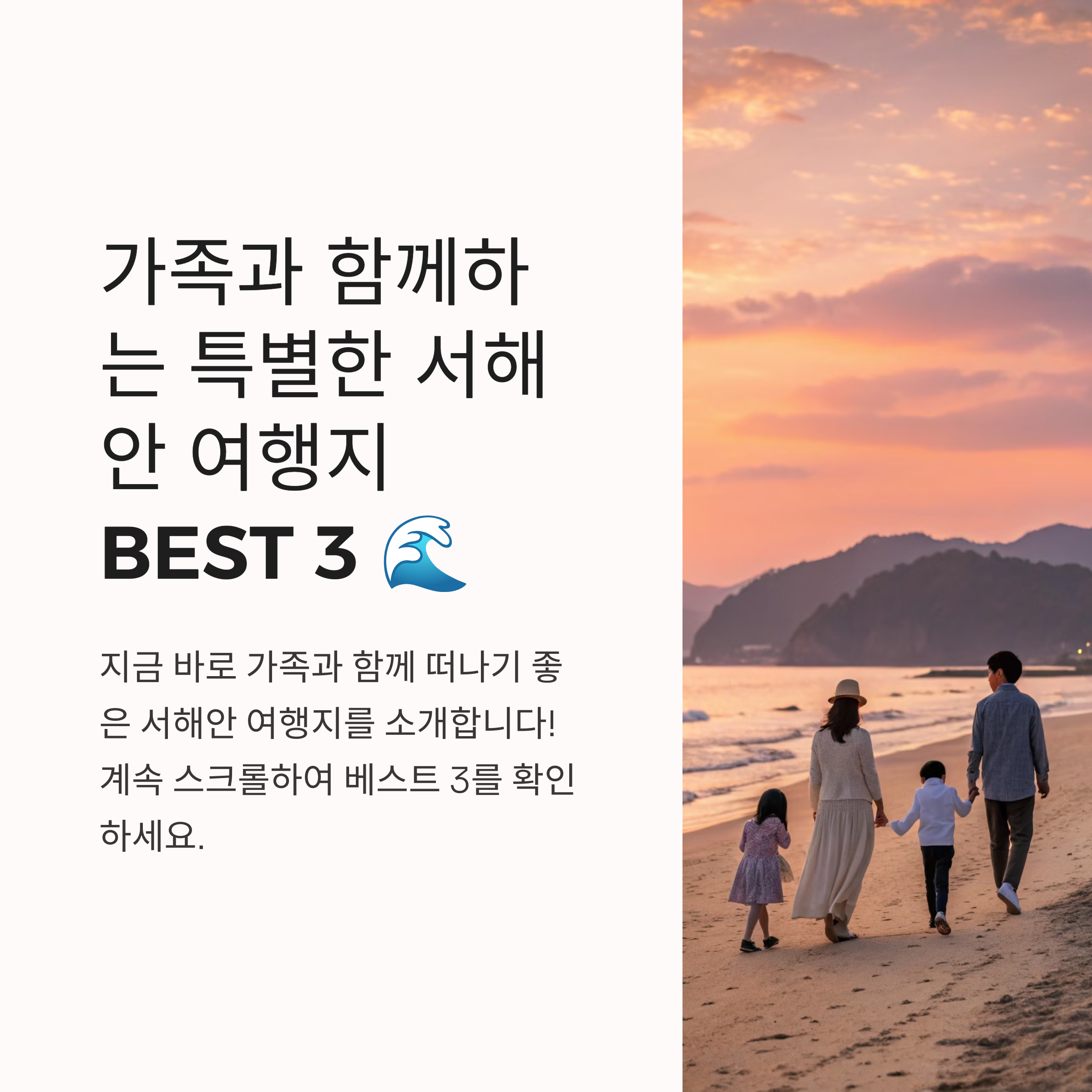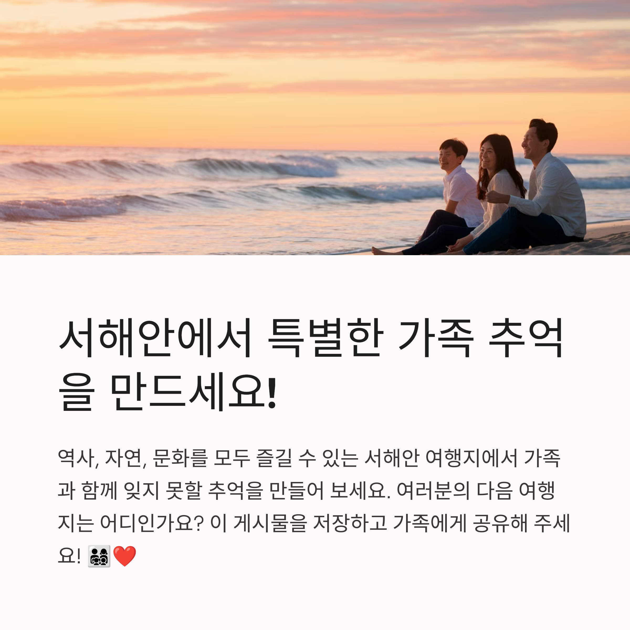 가족 여행은 단순한 이동이 아닌 함께 웃고 경험을 공유하며 추억을 쌓는 소중한 시간입니다. 강화도의 갯벌 체험과 역사 탐방, 태안의 자연 속 힐링과 꽃 축제, 군산의 문화 감성과 미식까지, 각기 다른 매력을 지닌 서해안 여행지는 여러분의 가족에게 특별한 기억을 선물할 것입니다. 이번 봄, 가까운 곳에서 진짜 가족 여행을 떠나보는 건 어떠세요?