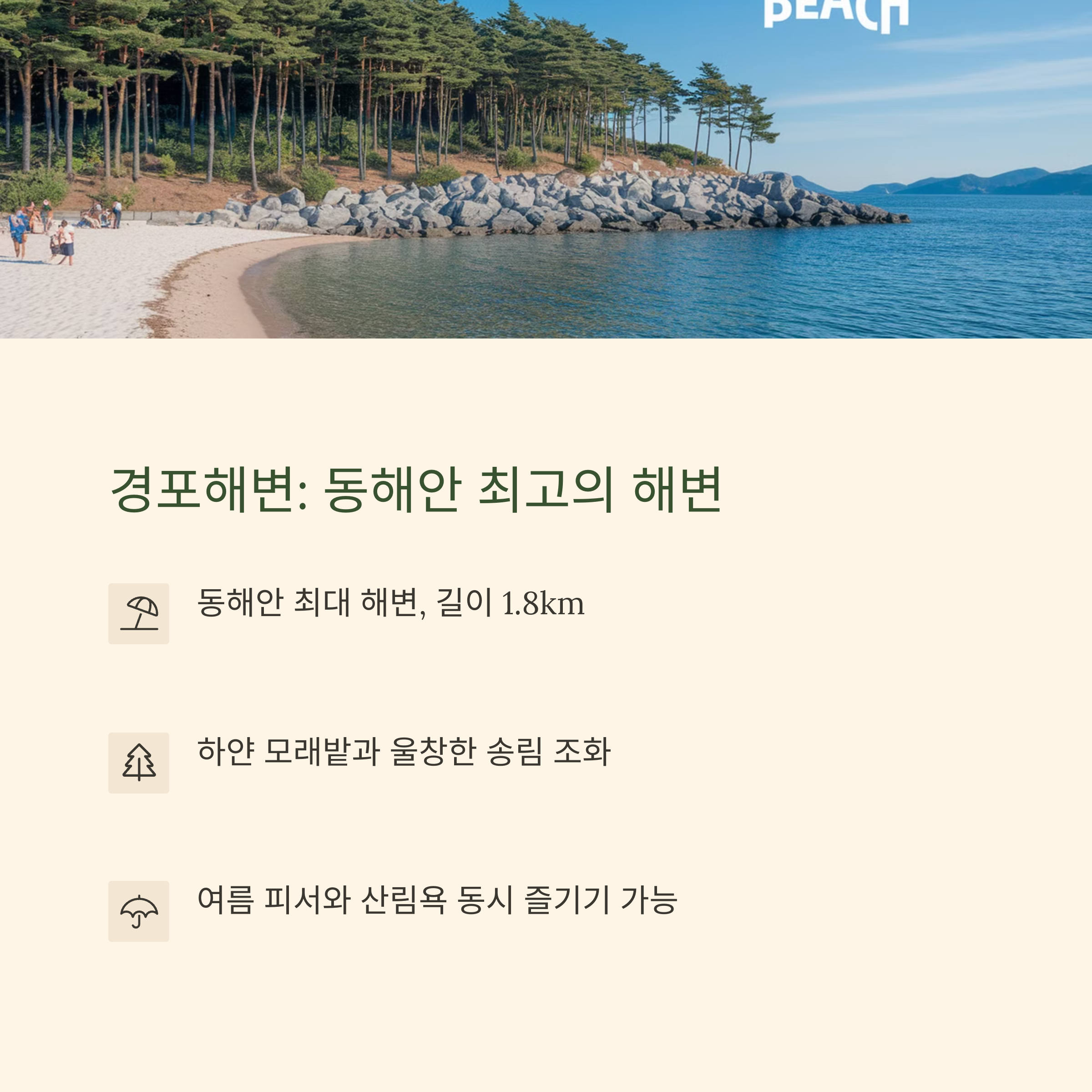 강릉 하면 떠오르는 첫 번째 장소, 경포해변은 약 1.8km에 이르는 백사장과 울창한 소나무숲이 조화를 이룬 명소예요. 연간 200만 명 이상이 방문한다고 하니, 그 인기가 어느 정도인지 짐작되죠(강릉시 관광 통계 기준). 발을 내디딜 때마다 모래가 부드럽게 밀려오는 느낌은 마치 “여기서 시간을 멈추고 싶다”고 말하는 듯해요.