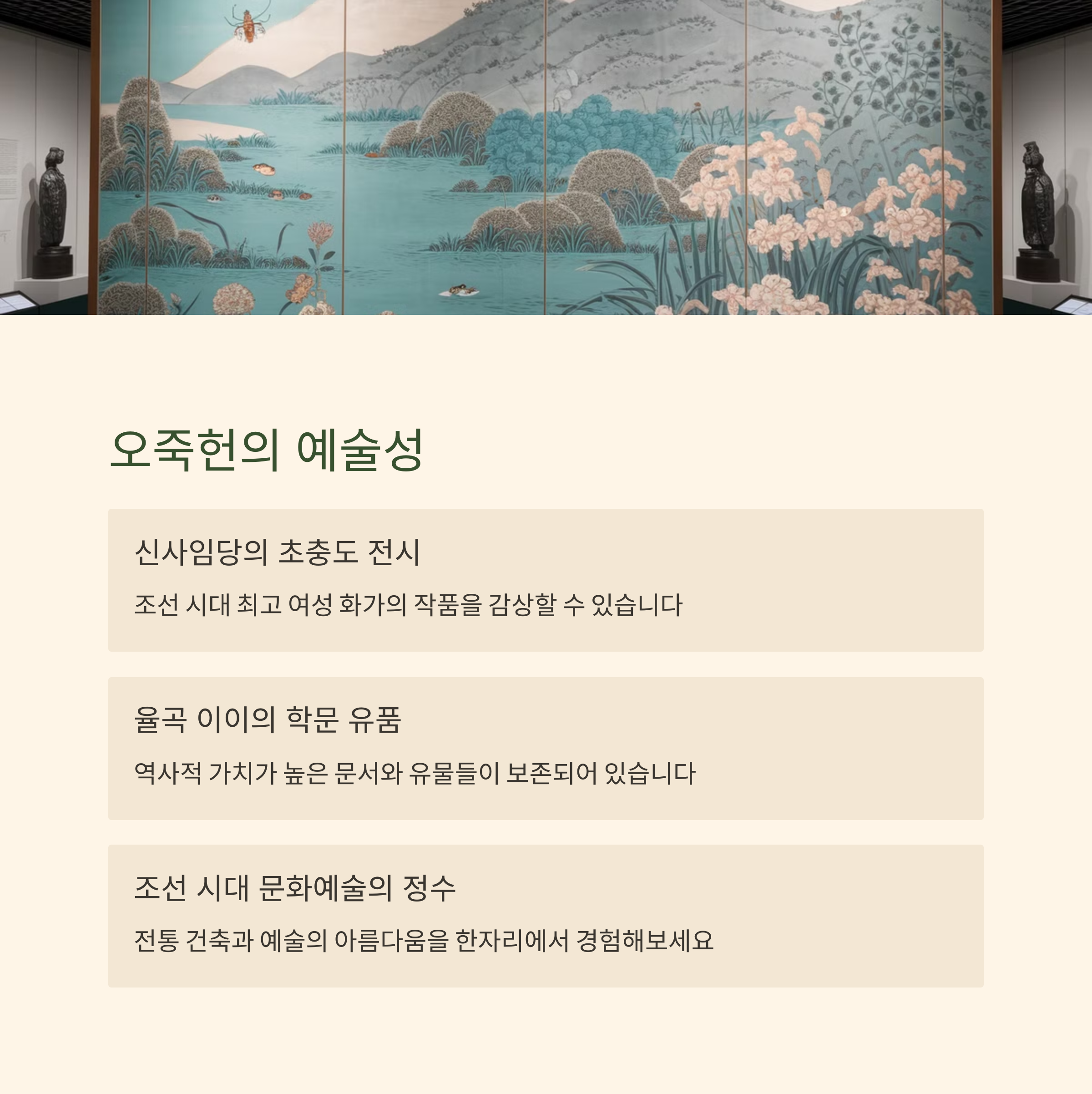 오죽헌은 조선의 위대한 학자 율곡 이이가 태어난 유서 깊은 장소예요. 연간 50만 명이 찾는 이곳(강릉시 문화재 관리소 통계)은 역사와 전통을 피부로 느낄 수 있는 공간이에요.