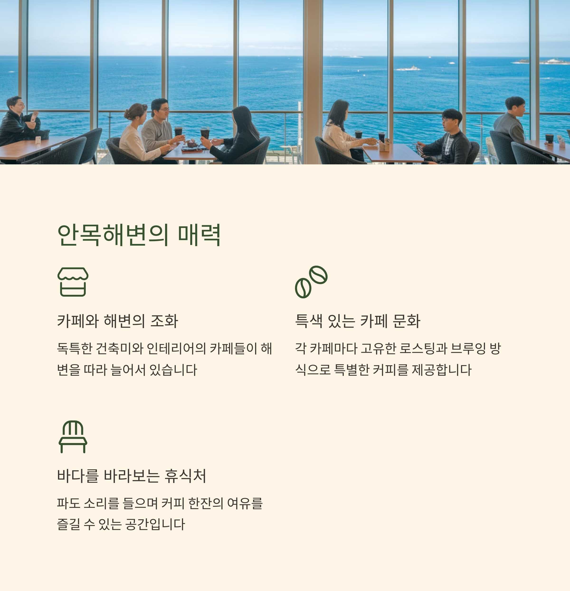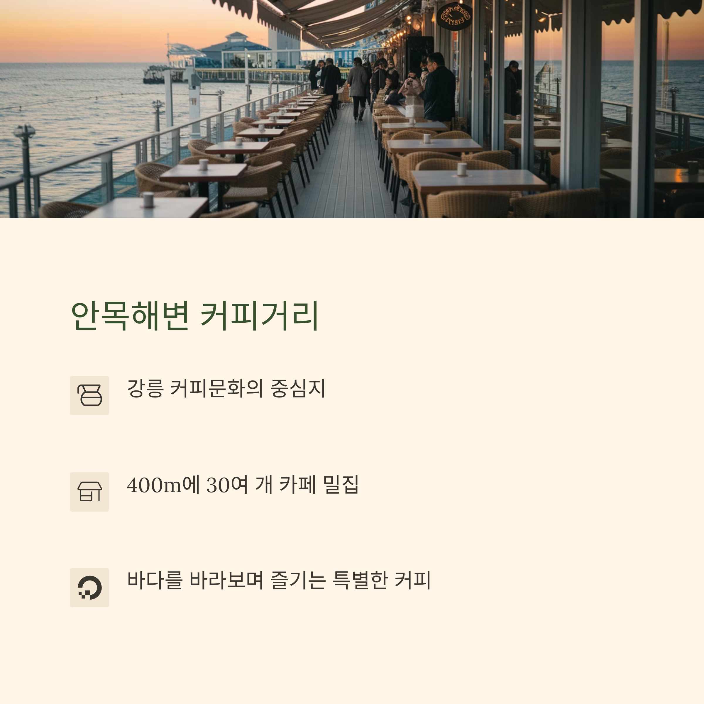 안목해변은 약 1km에 걸쳐 30여 개의 카페가 늘어선 ‘커피거리’로 유명해요. 연간 150만 명이 이곳을 찾는다니(강릉 관광 통계), 그 매력을 무시할 수 없죠.