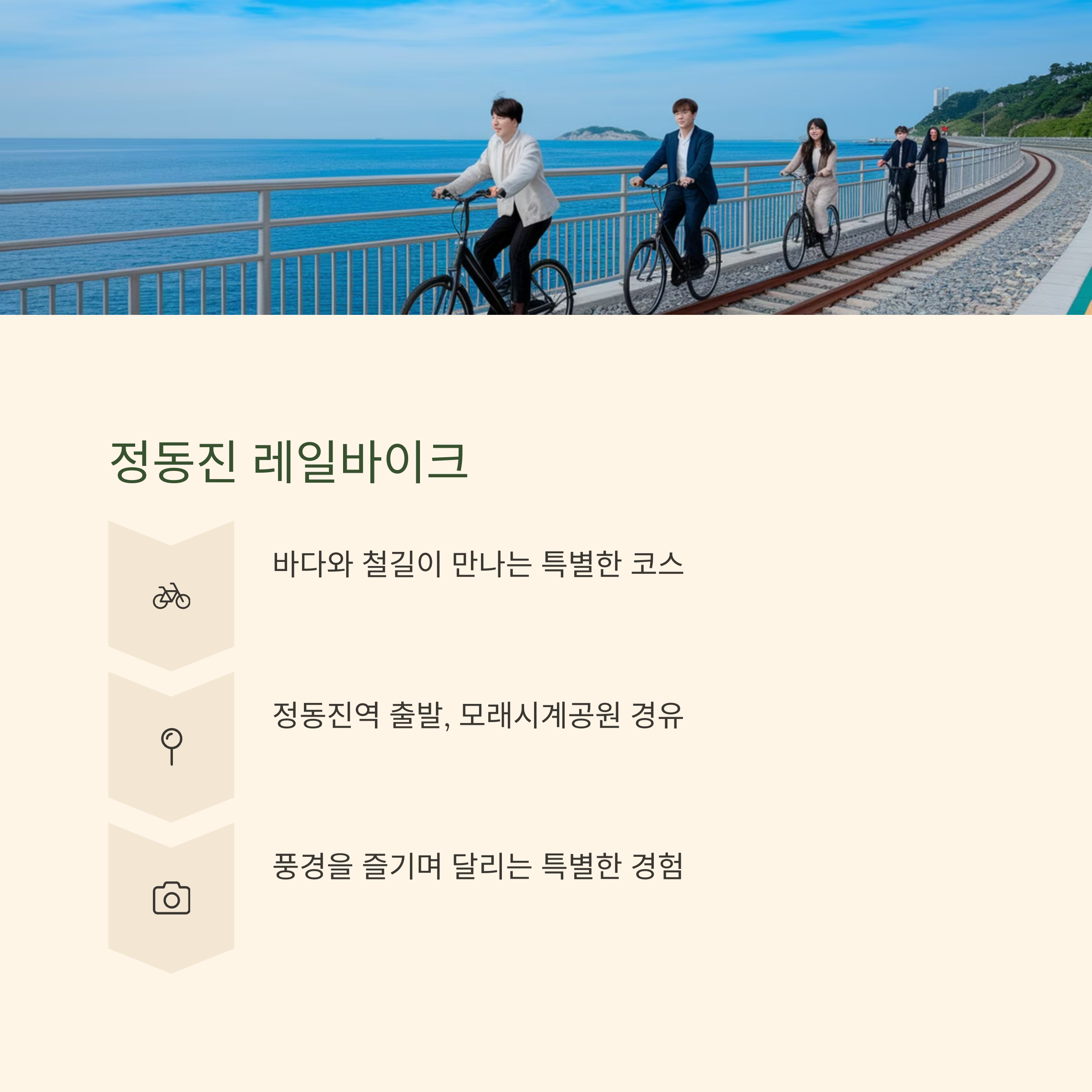 새벽 6시 30분, 수평선 위로 붉게 떠오르는 해를 보면 “인생의 새 챕터가 열리는 기분”이 들죠. 여기서 끝이 아니에요! 약 5.4km 구간의 레일바이크를 타며 바다와 산을 넘나드는 풍경은 짜릿함 그 자체예요.
