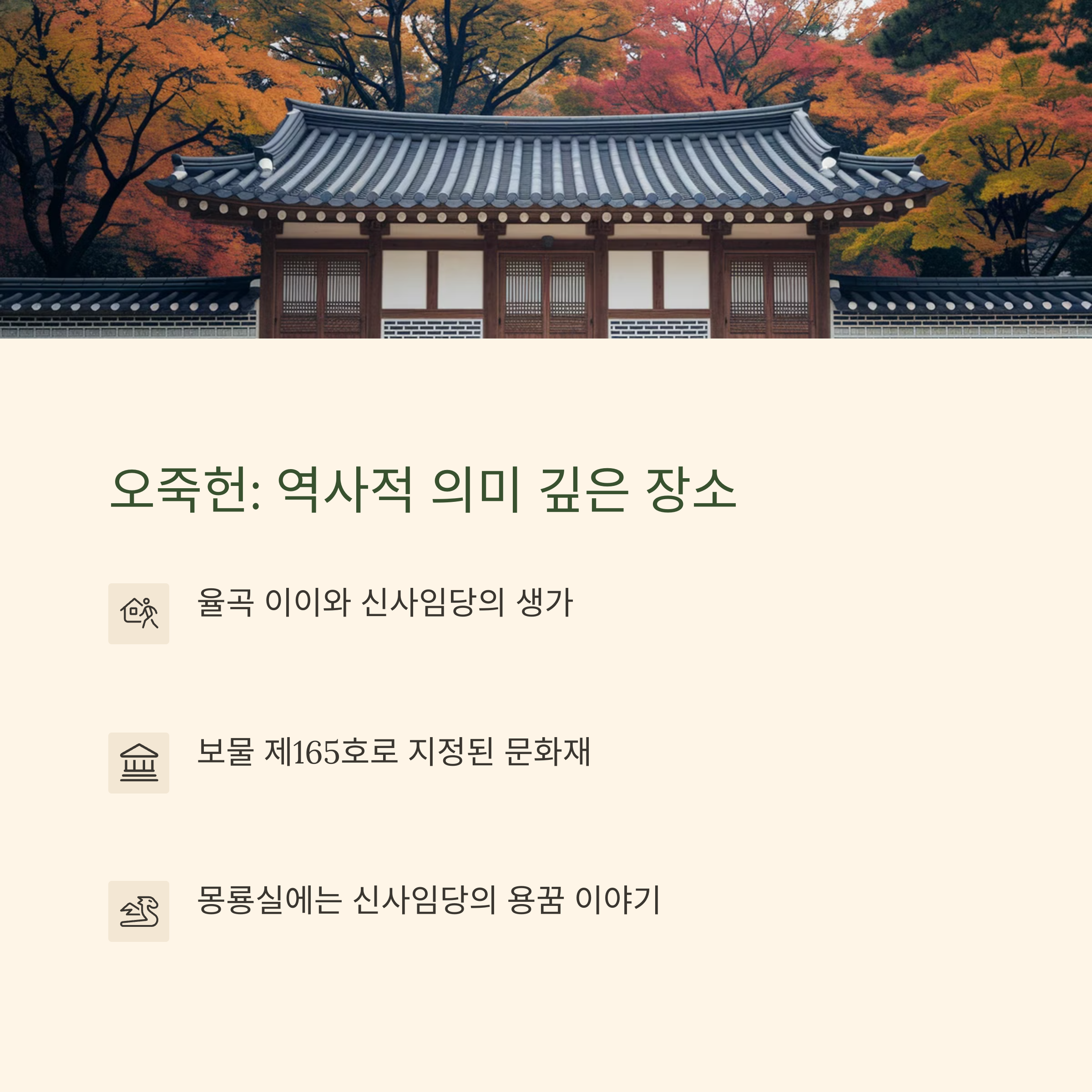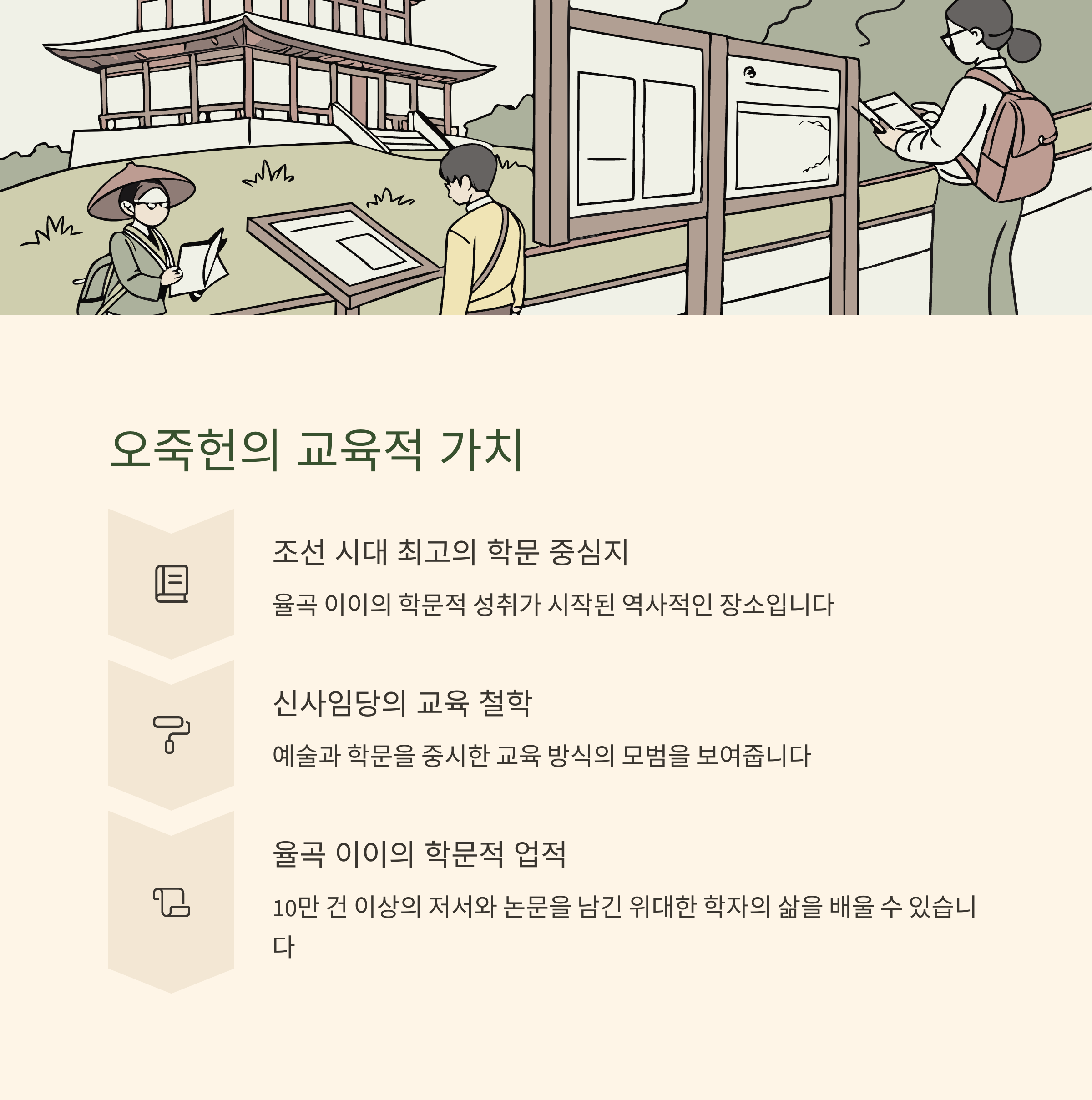 내부 박물관에서는 율곡의 생애를 엿볼 수 있어, 마치 과거로 시간 여행을 떠난 기분이 들더라고요. 한 방문객은 “여기선 바람 소리도 다르게 들린다”고 했는데, 정말 공감했어요. 프랑스 시인 보들레르의 “고독은 영혼의 친구”라는 말이 떠오르는 힐링 명소랍니다.