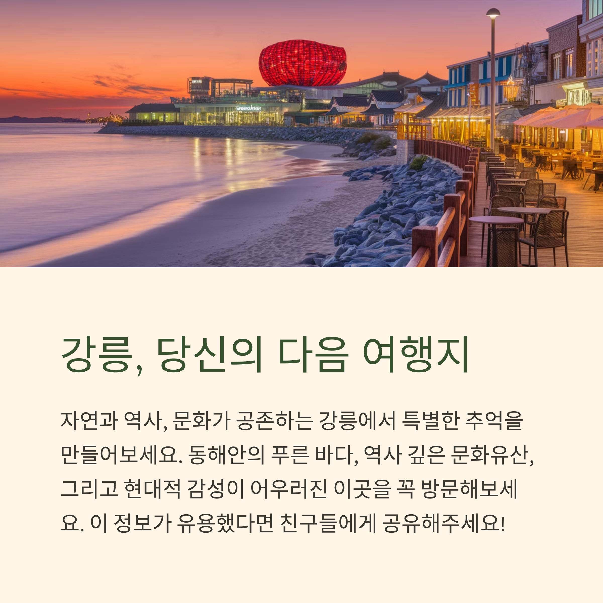 그러니 이곳에서 “가슴으로 느끼는 여행”을 경험해보세요. 한국 속담 “가보지 않으면 알 수 없다”처럼, 강릉에 직접 가봐야 그 진짜 매력을 알 수 있답니다. 자, 이제 어디부터 갈지 고민 시작해볼까요?