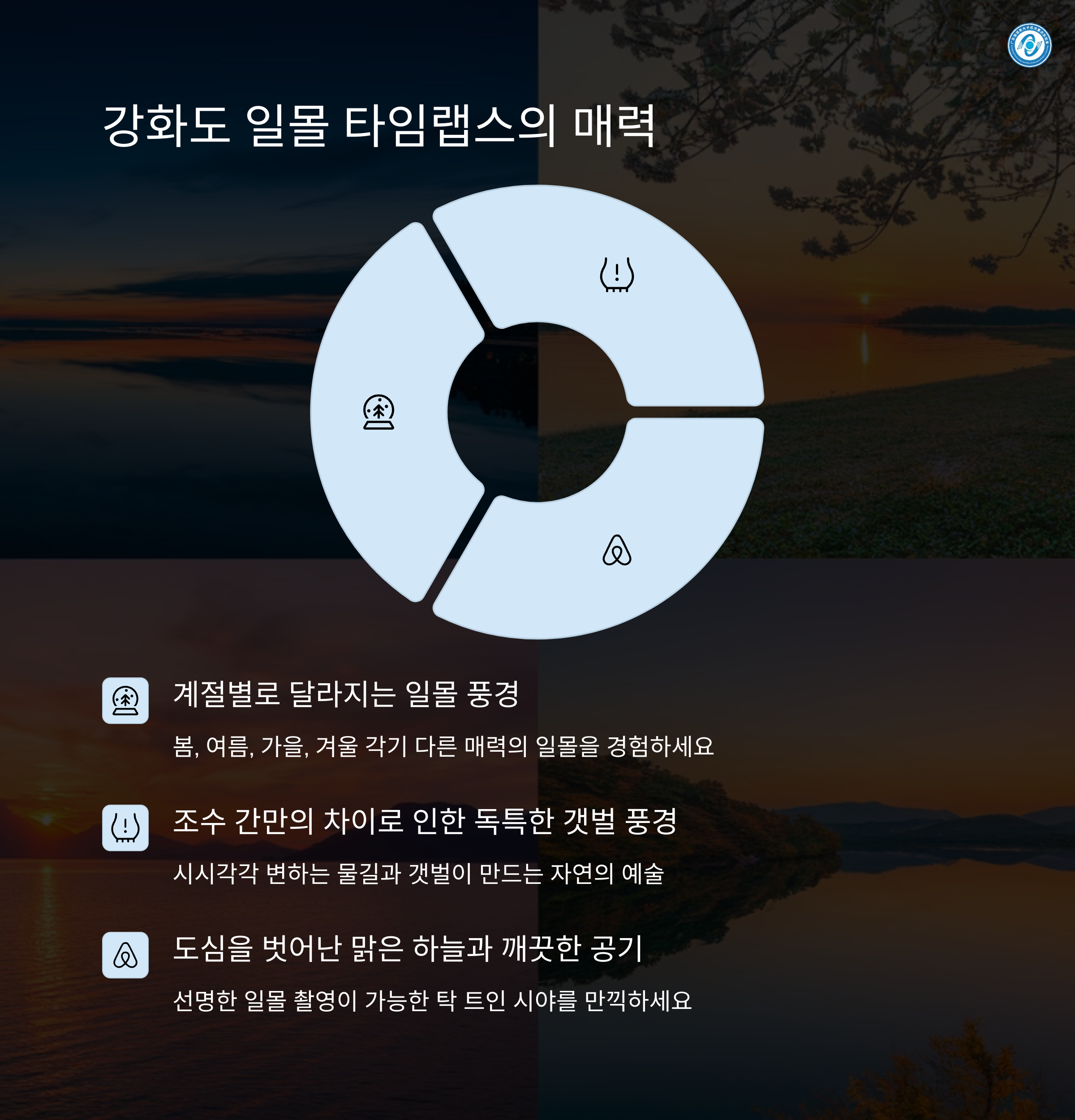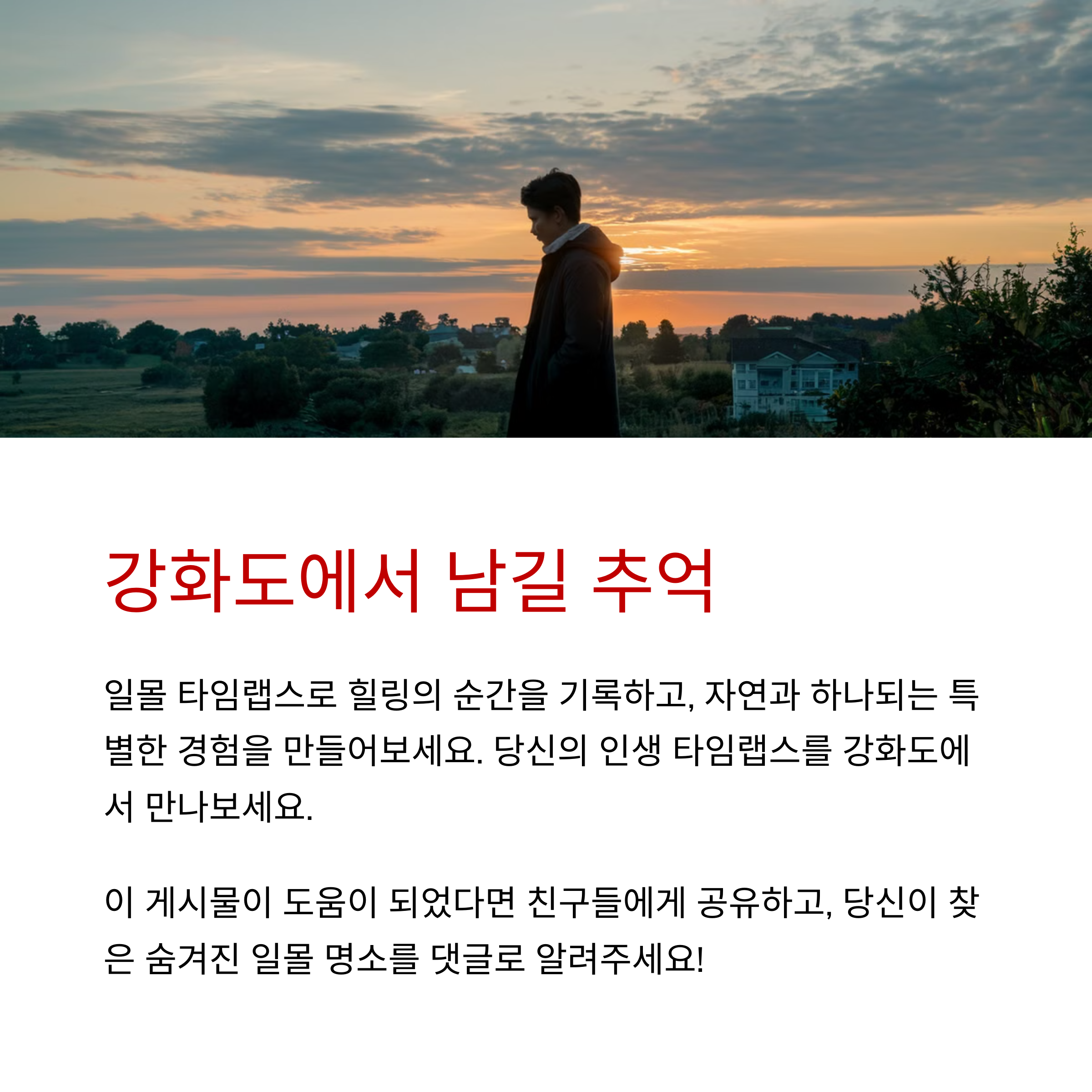 해가 지는 순간, 하늘과 바다가 하나로 어우러지는 황홀한 풍경을 영상에 담고 싶지 않으신가요? 강화도는 서해의 낭만적인 일몰과 감성적인 숙소가 조화를 이루며, 타임랩스 촬영을 즐기기에 더없이 훌륭한 여행지입니다.