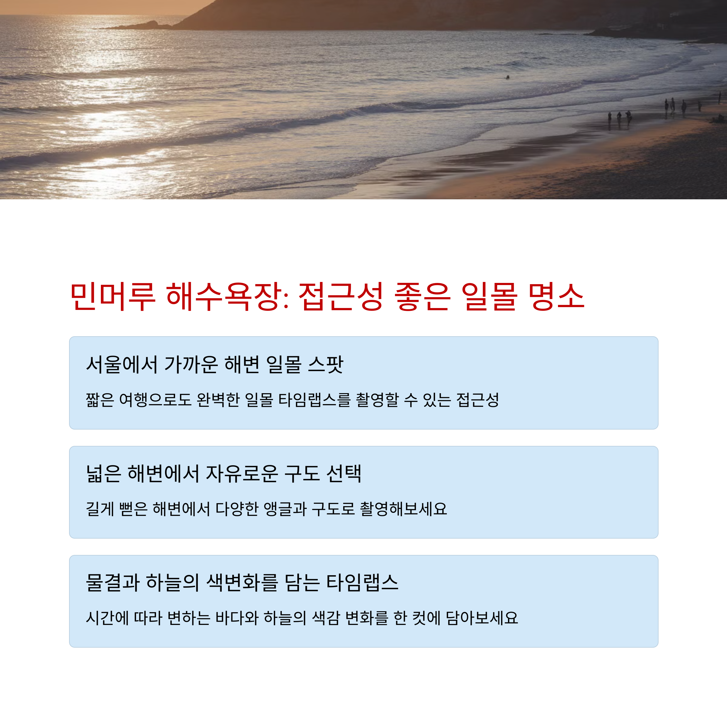 민머루 해수욕장은 서울에서 차로 한두 시간 거리에 있어 접근성이 뛰어난 곳이에요. 넓은 해변과 아름다운 석양이 어우러져 타임랩스 촬영에 최적입니다. 저는 파도 소리를 들으며 촬영했는데, 이터널 선샤인의 “바다는 모든 것을 받아들이고 치유한다”는 대사가 딱 맞아떨어지더라고요.