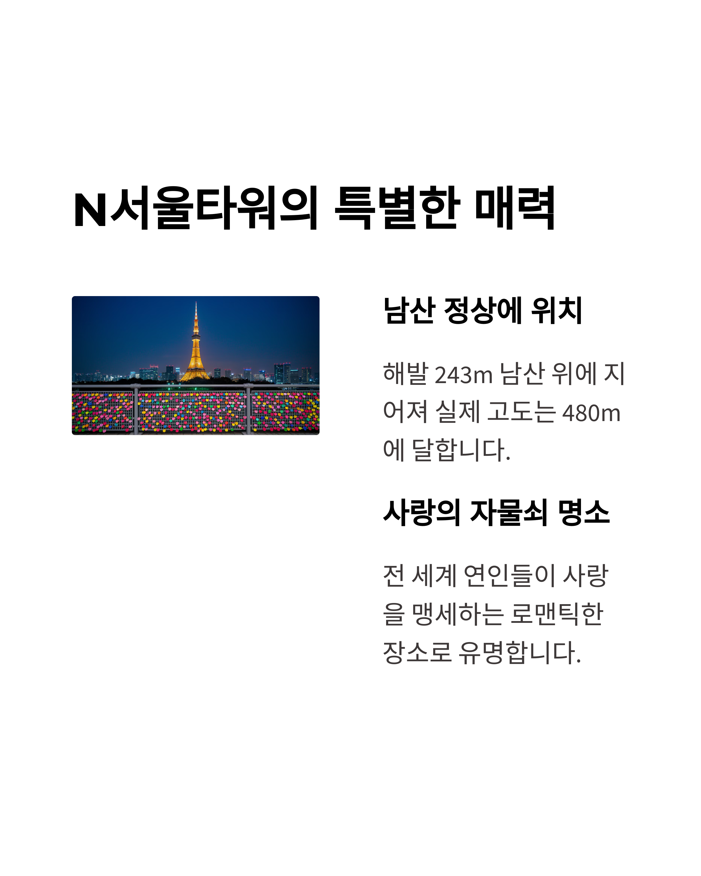 N서울타워는 남산 정상에 자리 잡아 실제 높이 480m에서 서울을 내려다볼 수 있어요. 야경을 보러 갔을 때, 반짝이는 도시 불빛을 보며 “서울의 밤은 정말 별처럼 빛나네!”라는 말이 절로 나왔어요. 연인들이 자물쇠를 걸며 사랑을 약속하는 모습도 인상적이었죠. 영화 어바웃 타임에서처럼 평범한 순간이 특별하게 느껴지는 곳이에요.