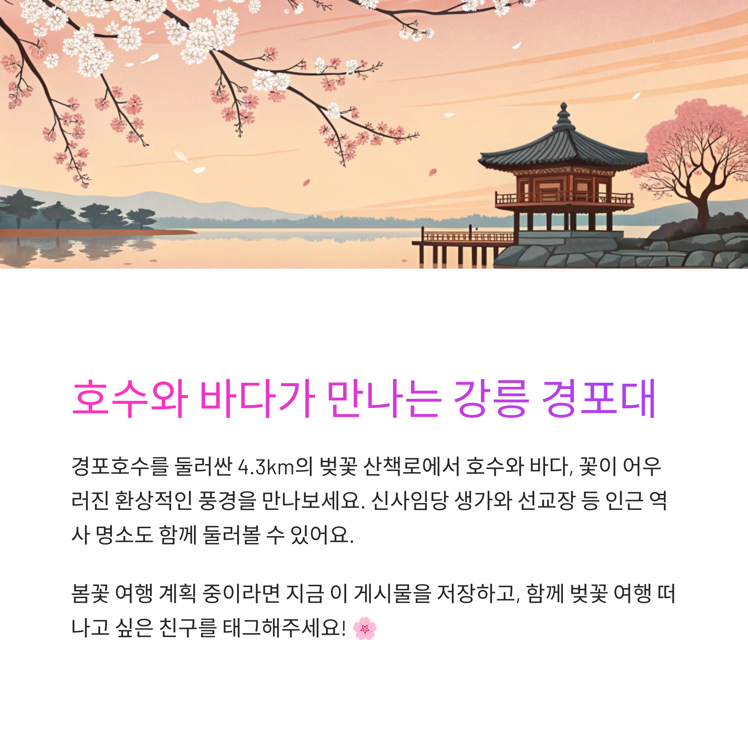 '명불허전(名不虛傳)'이란 말처럼, 강릉 경포대의 벚꽃은 그 유명세에 걸맞게 아름답습니다. 특히 경포호에 비친 벚꽃과 경포대의 모습은 '경포대 월파정'에서 가장 잘 볼 수 있으며, 이곳은 SNS에서 '인생샷 명소'로 꼽히기도 합니다. 근처에는 '강릉 커피거리'가 있어, 벚꽃 구경 후 여유로운 커피 한 잔으로 마무리하기 좋습니다.