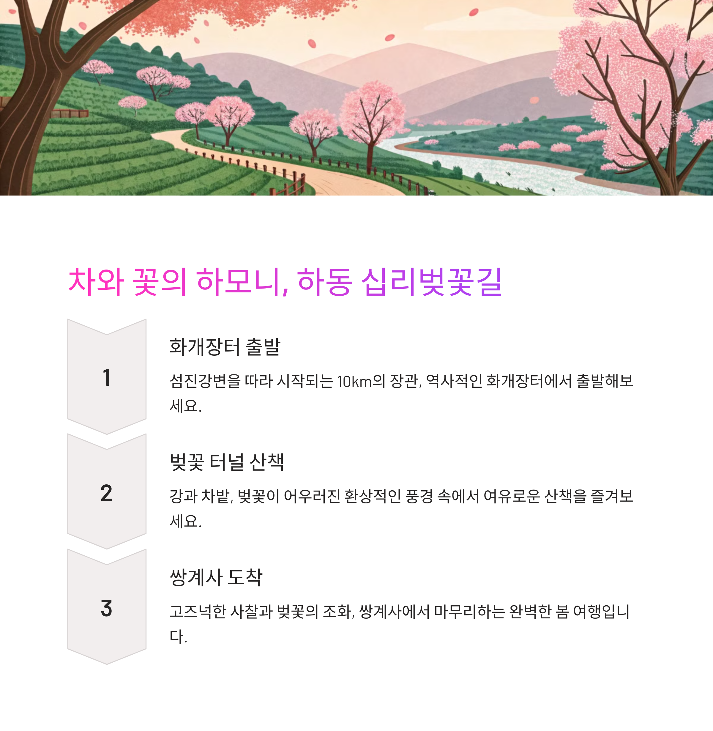 경남 하동의 쌍계사로 향하는 '십리벚꽃길'은 약 4km 구간에 1,200여 그루의 벚나무가 심어져 있어, 말 그대로 십리에 걸쳐 꽃이 만개하는 장관을 연출합니다. 특히 이곳은 '하동 야생차 문화축제'와 시기가 겹쳐, 벚꽃과 차를 함께 즐길 수 있는 특별한 명소입니다. 하동군의 통계에 따르면, 벚꽃 시즌에는 주말 기준 일일 방문객이 약 2만 명에 달하며, 이 중 약 35%는 외국인 관광객이라고 합니다.