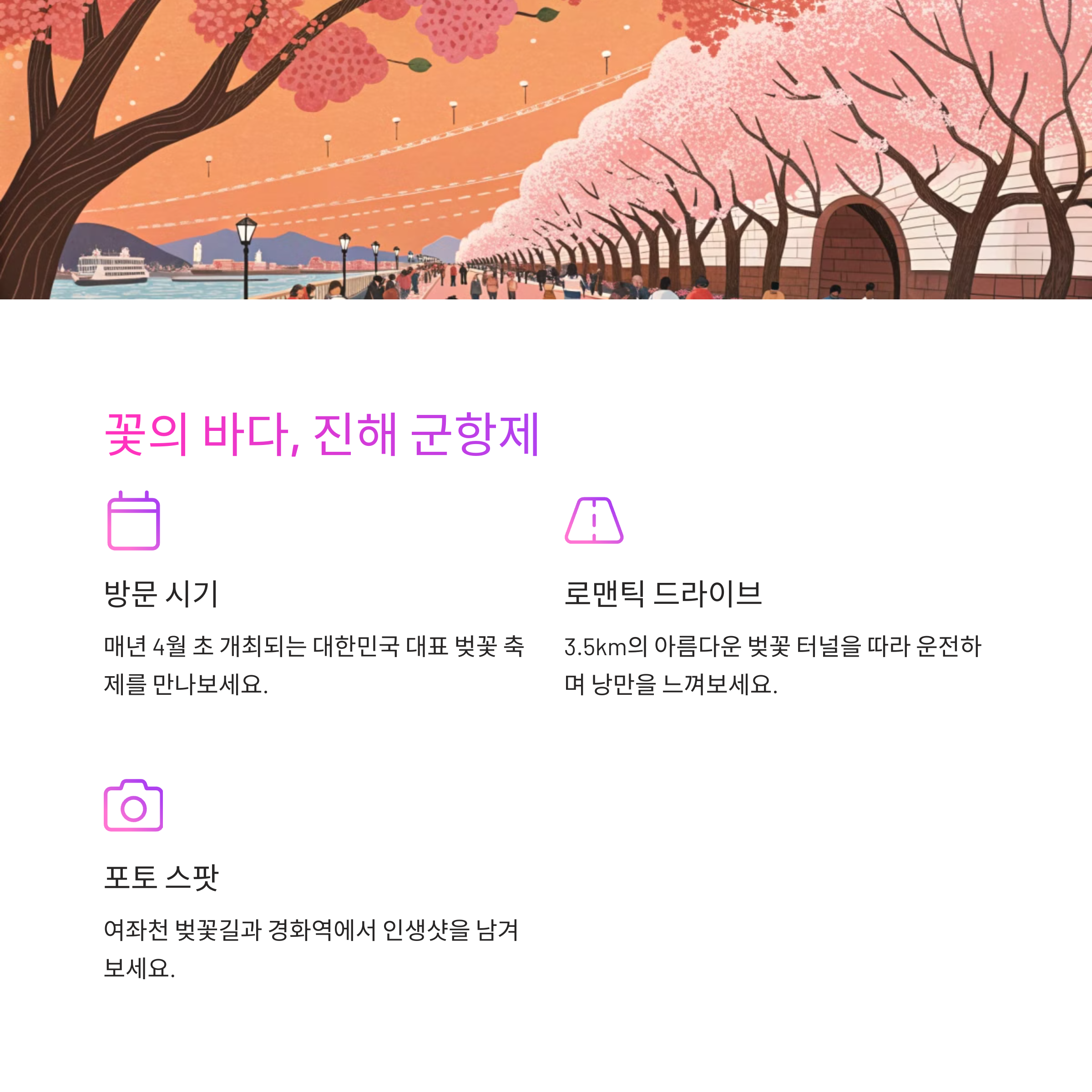 국내 관광 플랫폼의 조사 결과, 봄철 여행 선호도에서 '벚꽃 명소'가 전체의 37.5%로 1위를 차지했는데요, '백문이 불여일견(百聞不如一見)'이라는 말처럼 직접 눈으로 보는 봄의 아름다움은 그 어떤 말로도 표현하기 어렵습니다. 지금부터 전국의 숨은 벚꽃 명소와 함께 특별한 봄 여행지를 소개해 드립니다.
