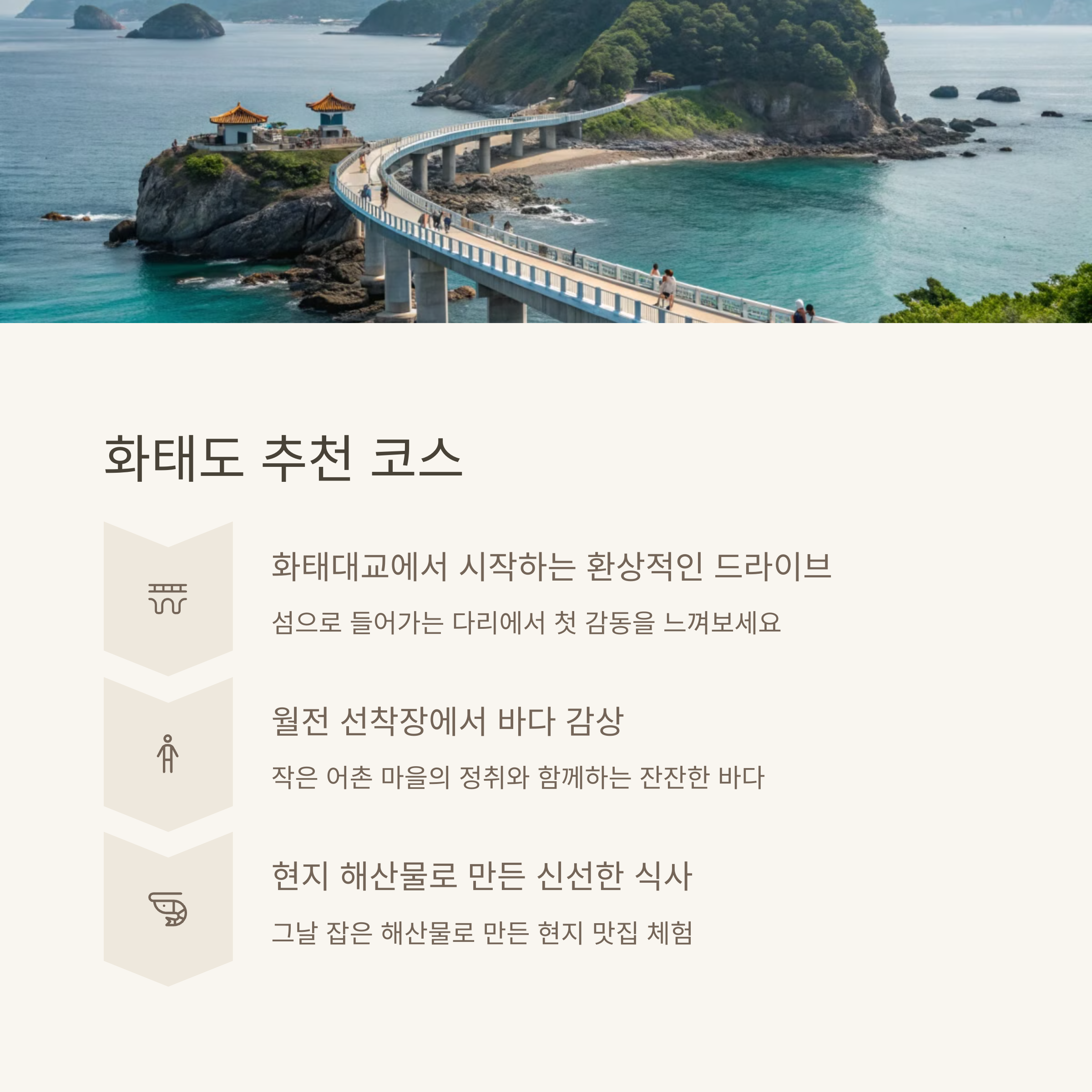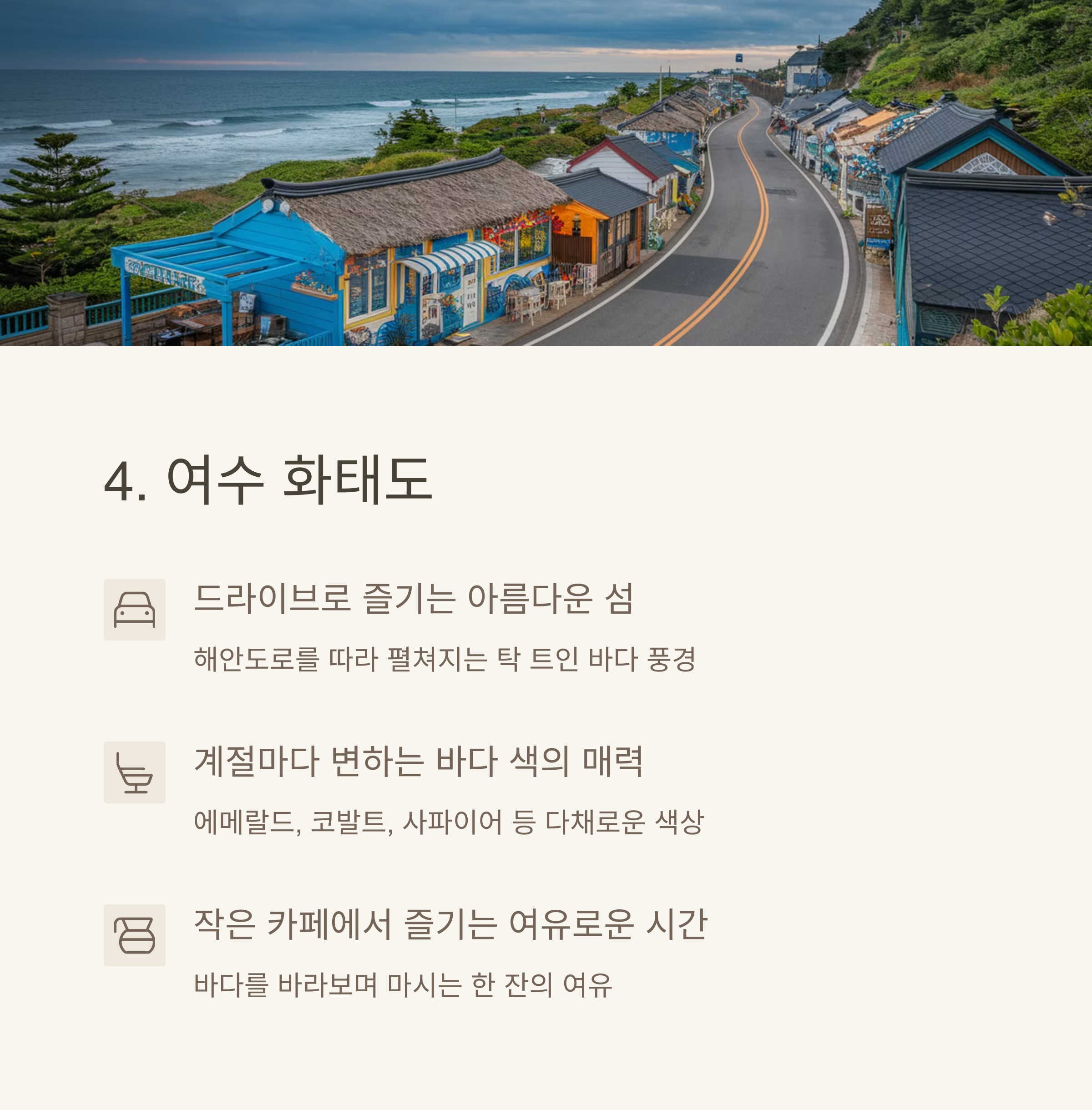 여수 화태도는 다리로 연결된 섬이라 차로 쉽게 갈 수 있어요. 섬을 한 바퀴 도는 데 30분이면 충분한데, 그 짧은 시간 안에 만나는 풍경은 정말 감동적이에요. 바다를 따라 달리다 보면 계절마다 색이 달라지는 남해가 창밖으로 펼쳐져요. 봄엔 연둣빛, 여름엔 에메랄드빛, 가을엔 황금빛이죠.