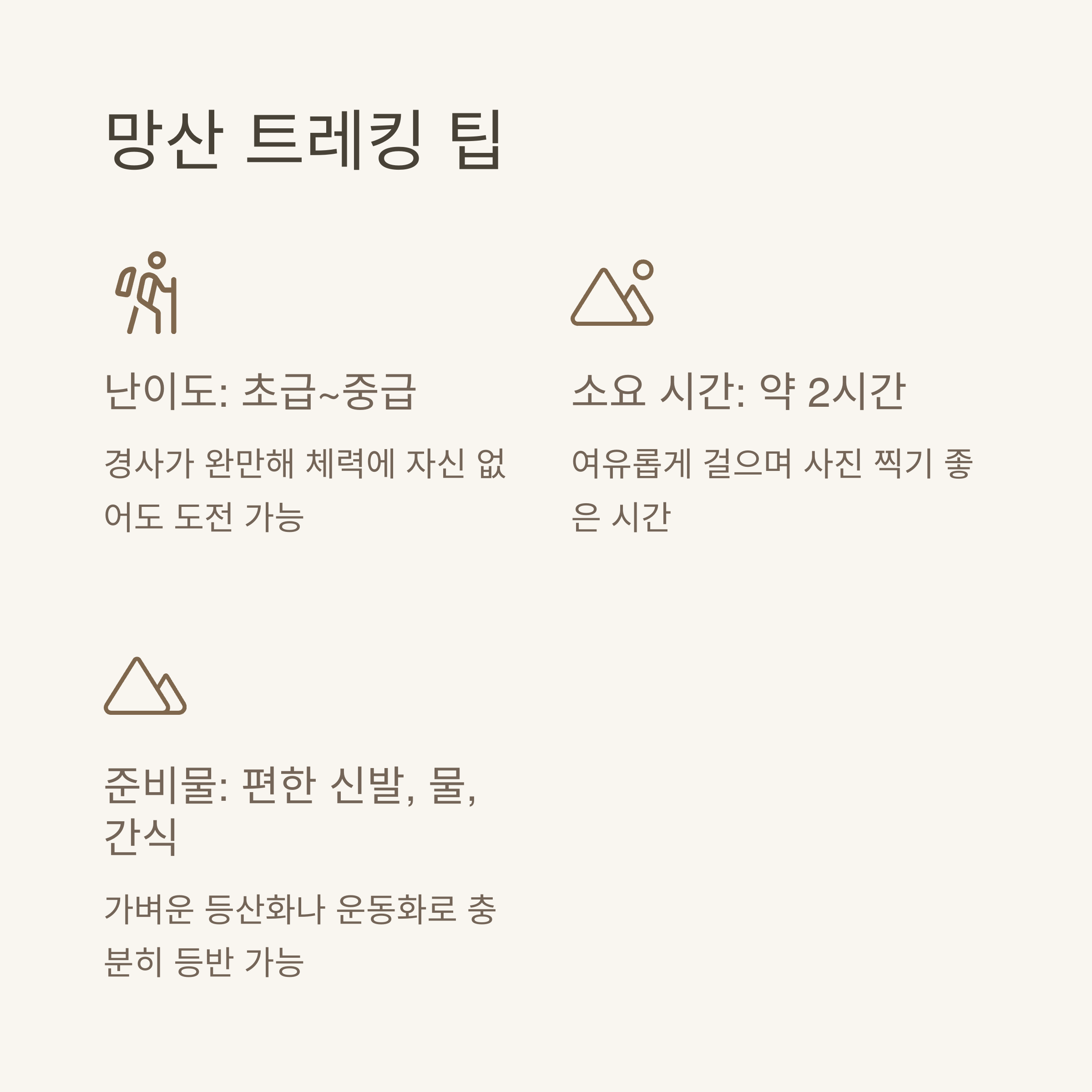 거제 망산은 숨겨진 등산 명소예요. 약 3km의 트레킹 코스는 초보자도 무리 없이 오를 수 있어요. 정상에 서면 푸른 바다와 산이 한눈에 들어오는데, 그 순간 “와, 내가 이걸 왜 이제 알았지?”라는 생각이 절로 들더라고요.