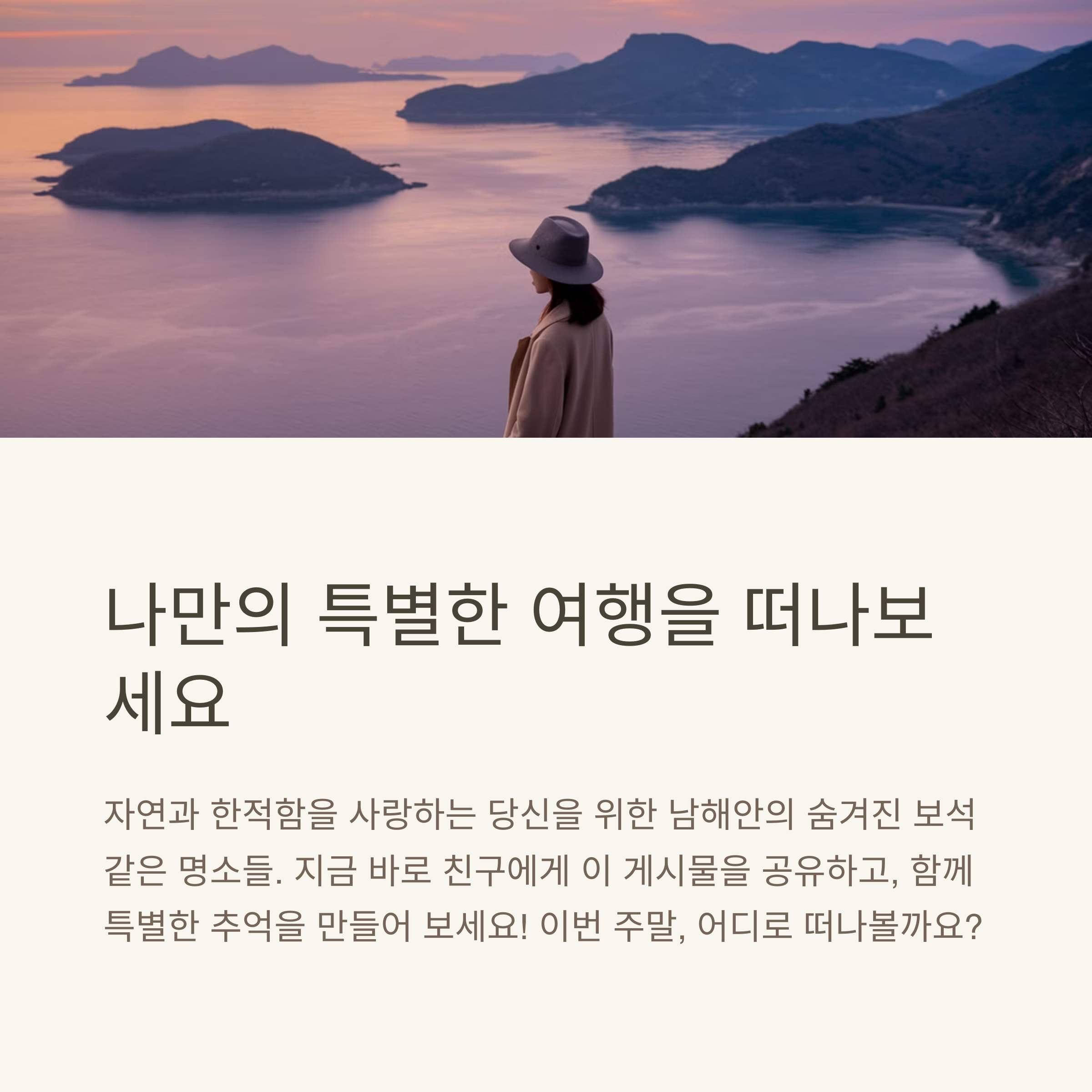 한적한 섬부터 그림 같은 마을까지, 남해안의 진짜 매력을 느껴보세요. 한국 속담에 “백문이 불여일견”이라는 말이 있듯, 직접 가보지 않으면 모를 풍경들이 기다리고 있답니다. 자, 준비되셨나요? 함께 떠나볼게요!