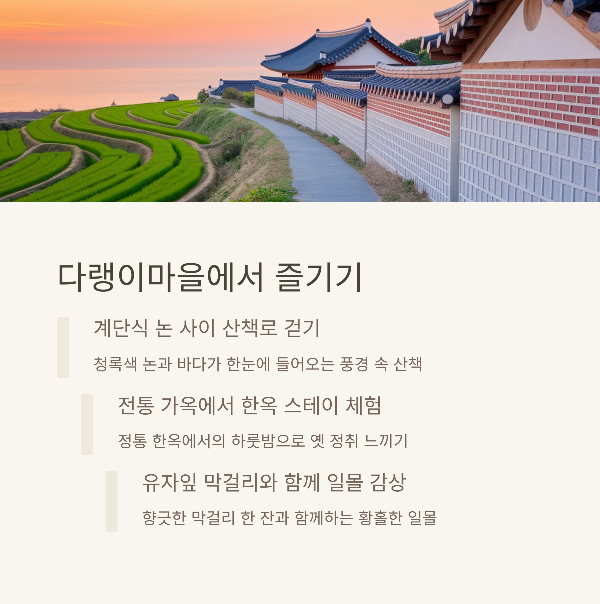 남해 다랭이마을은 바다를 향해 층층이 펼쳐진 논으로 유명해요. 경사가 가파른 탓에 기계 대신 손으로 일군 논들이 만들어낸 풍경은 마치 그림 같아요. 해가 지면서 논 사이로 스며드는 빛은 감동 그 자체였죠. 마을을 걷다 보면 돌담과 기와지붕이 어우러진 전통 가옥들이 눈에 들어와요.