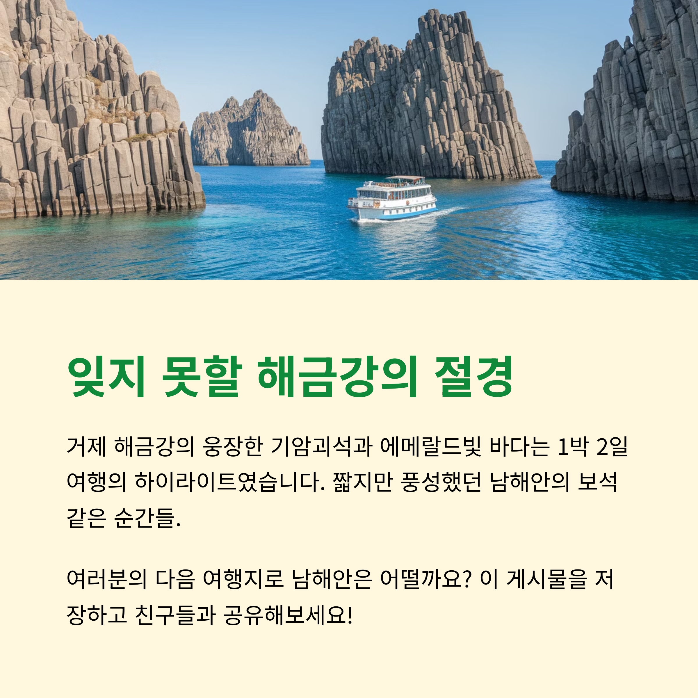 여행의 마지막은 해금강이었어요. 유람선을 타고 기암괴석과 에메랄드빛 바다를 감상하며 "이건 자연이 만든 조각품이야!" 하고 외쳤답니다. 바다 위에서 바라본 해금강의 비경은 정말 "바다의 보석" 같았어요. 친구는 "이걸로 여행 마무리하니 딱 좋네"라며 만족스러운 표정을 지었고, 저는 "다음엔 여기서 낚시라도 해볼까?" 하며 농담을 던졌죠. 유람선 위에서 맞는 바람과 풍경은 여행의 피날레로 손색없었답니다.