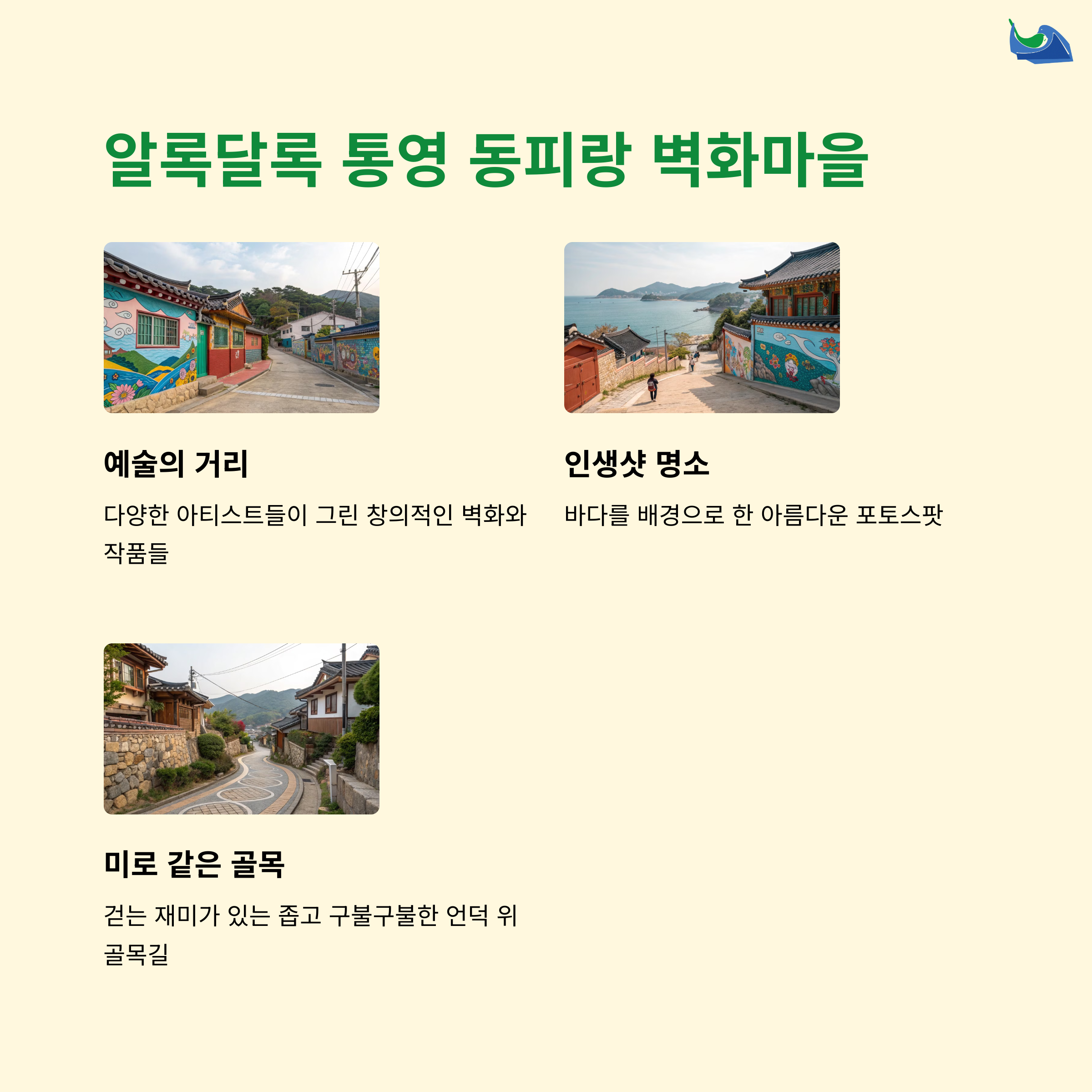 둘째 날 아침, 통영의 동피랑 벽화마을로 향했어요. 이곳은 마치 거대한 캔버스에 색색의 물감을 뿌려놓은 듯했죠. 좁은 골목길을 따라 걷다 보니, 동화 속 캐릭터부터 통영의 풍경까지 담긴 벽화들이 눈을 사로잡았어요. 특히 통영 시내 전경을 배경으로 한 벽화 앞에서 사진을 찍으며 "이거 인생샷이다!" 하고 외쳤답니다. 친구는 "벽화가 너보다 잘생겼네"라고 놀렸고, 저는 "그럼 내가 벽화 옆에서 조연이라도 해야지!" 하며 포즈를 취했어요. 골목마다 숨은 이야기를 찾는 재미가 쏠쏠했답니다.