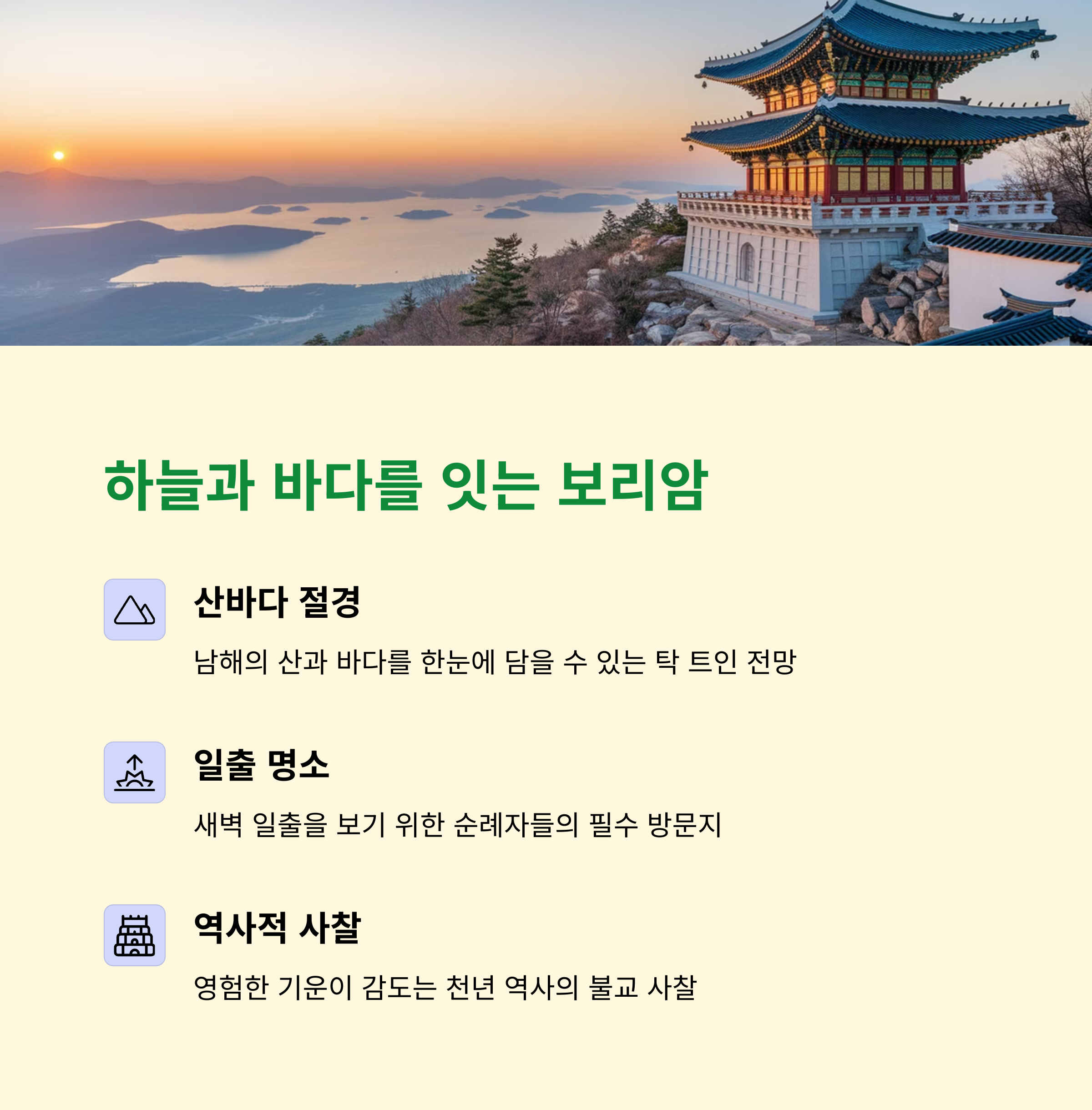 1일차의 대미는 보리암이었어요. 남해 금산 정상 부근에 자리 잡은 이 사찰은 등산로를 따라 올라가야 했는데, 솔직히 땀이 좀 났답니다. "운동화 신길 잘했네" 하며 숨을 몰아쉬었죠. 하지만 정상에 도착한 순간, 그 노고가 싹 보상받는 기분이었어요. 탁 트인 바다를 배경으로 한 사찰의 모습은 그야말로 "바다를 품은 산중의 보석" 같았죠. 저는 그 풍경을 보며 "여기서 일출 보면 장관일 텐데"라고 중얼거렸어요. 친구가 "그럼 새벽에 다시 와?"라고 놀리자, 저는 "음… 침대가 더 좋을지도" 하며 웃었답니다. 그래도 그곳에서 잠시 눈을 감고 바람을 느끼며 힐링했어요.