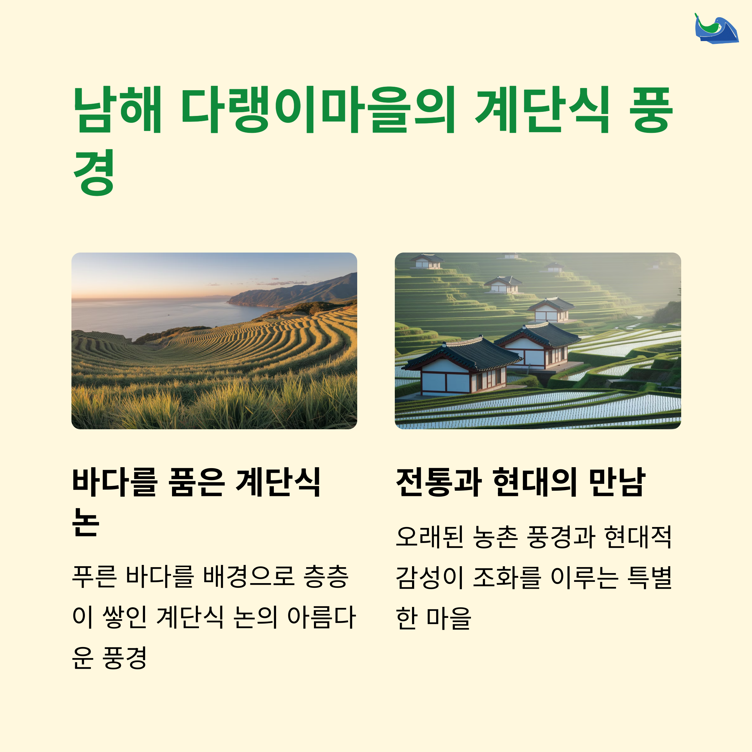 여행의 첫 시작은 언제나 설렘으로 가득하죠. 남해안의 숨은 보석 같은 명소들을 찾아 떠나는 여정은 그야말로 기대감으로 가득했답니다. 짧은 1박 2일의 시간이었지만, 다랭이마을의 논밭, 독일마을의 이국적 감성, 보리암의 청량한 공기를 만끽할 수 있었고,