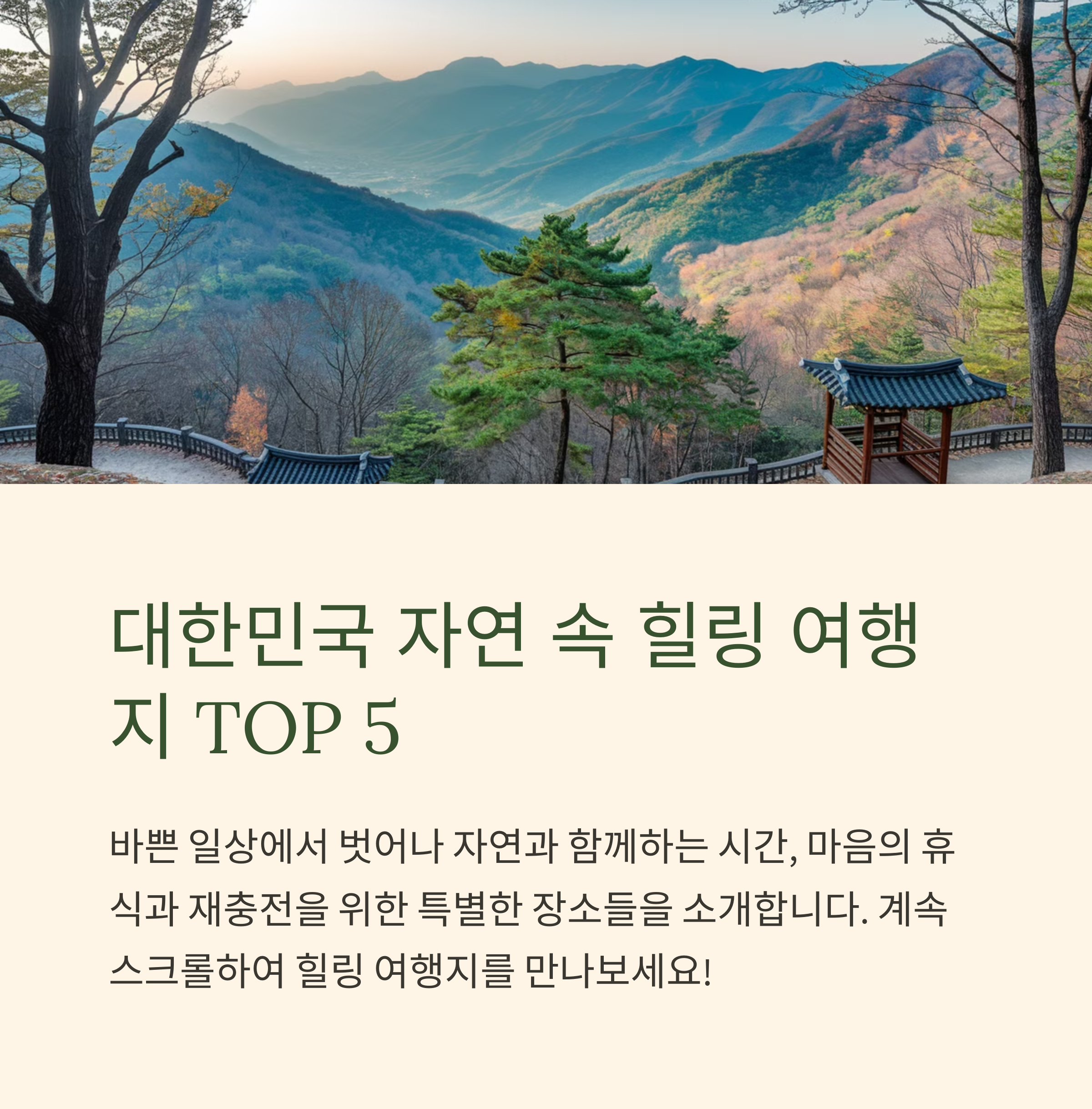 '산 좋고 물 좋은 곳'이라는 표현이 있죠. 우리나라는 국토의 70%가 산지로 이루어져 있어 도시를 조금만 벗어나도 아름다운 자연을 만날 수 있습니다. 요즘같이 바쁜 일상에 지친 현대인들에게 자연 속 휴식은 '약보다 나은 보약'이 되곤 합니다.