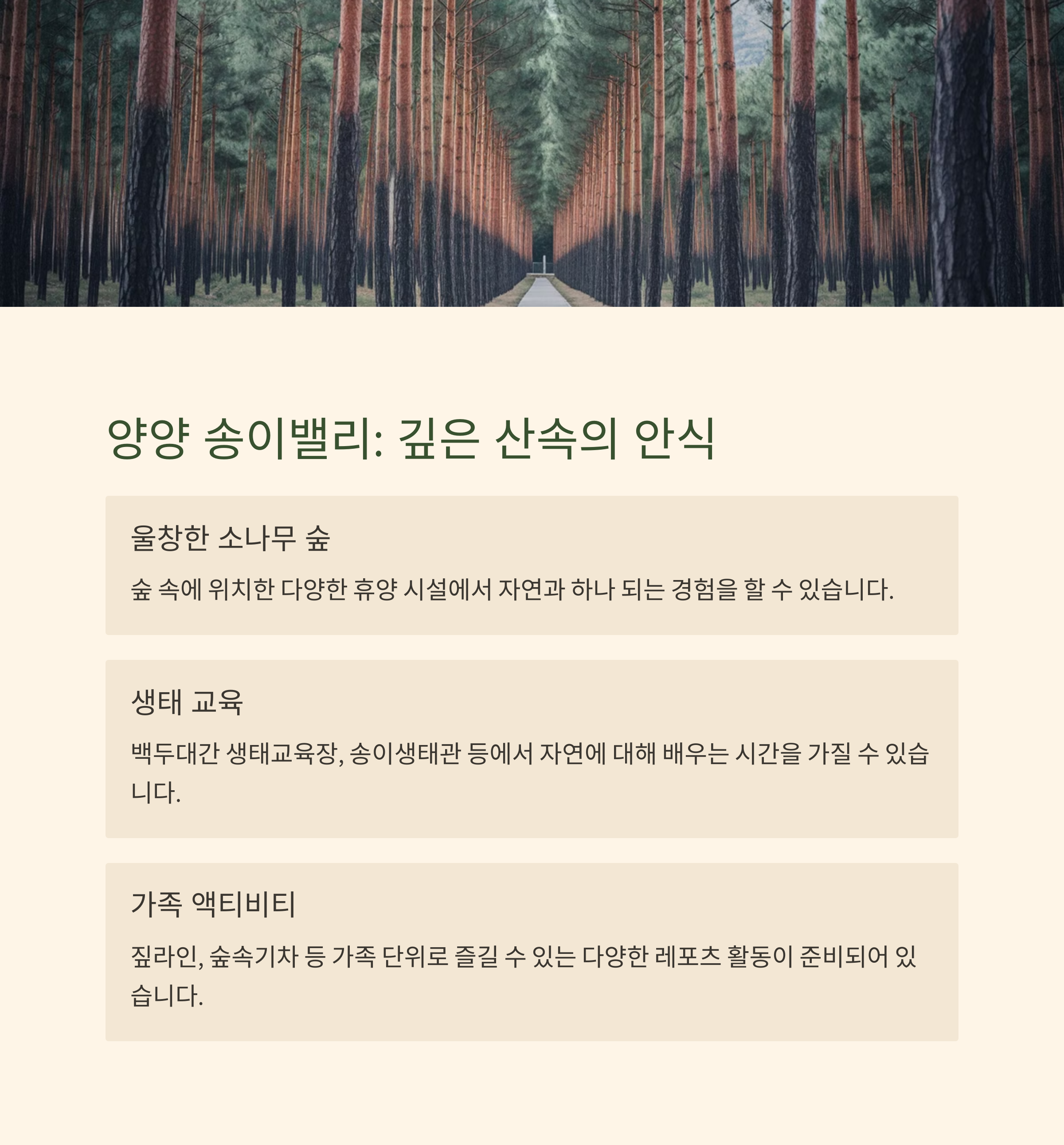 강원도 양양에 위치한 이 휴양림은 면적 1,648,931㎡의 울창한 산림 속에 자리잡고 있습니다. 2023년 산림청이 발표한 '휴양 만족도 조사'에서 92.7점을 기록하며 전국 자연휴양림 중 상위 5%에 선정된 명소입니다.