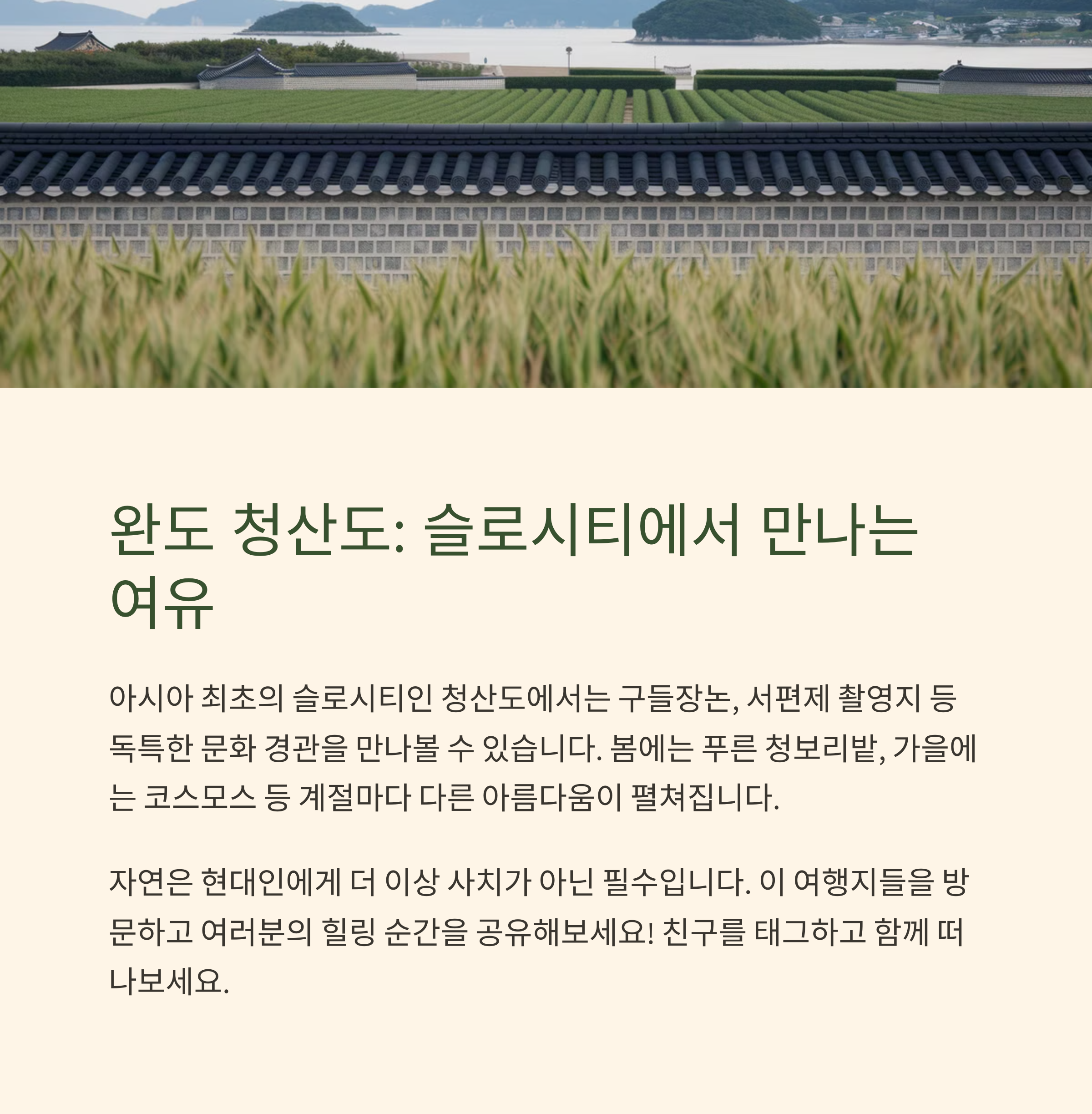 청산도의 매력은 '느리게 걷기'에 있습니다. '슬로 워킹 페스티벌'로 유명한 이곳의 '느린 길'은 총 42.195km, 16개 코스로 구성되어 있으며, 그 중 가장 인기 있는 3코스(범바위~당리항, 5.5km)는 바다와 산을 동시에 감상할 수 있는 절경을 자랑합니다. 2022년 관광객 설문 조사에서 96.3%가 '재방문 의사 있음'이라고 답한 것도 납득이 갔습니다.