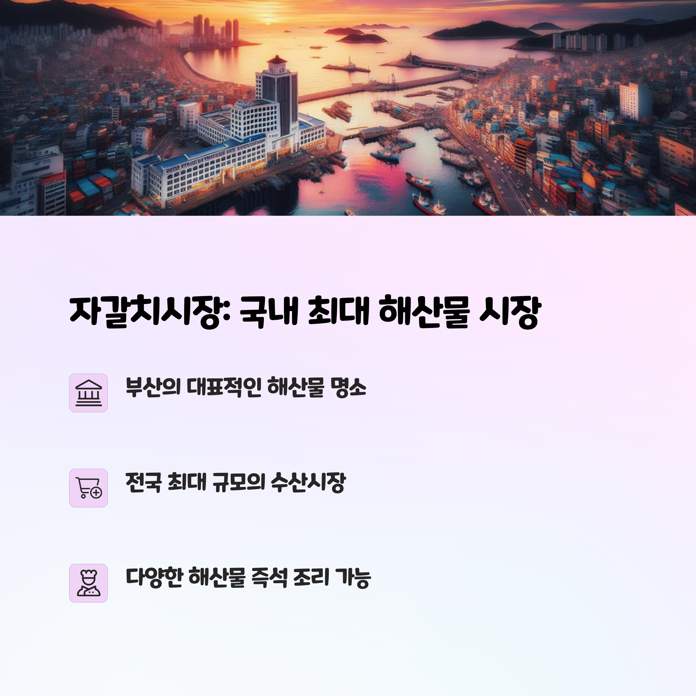 부산의 자갈치시장은 말 그대로 해산물의 세계를 한눈에 담을 수 있는 장소입니다. 규모만 보아도 전국 최대라는 타이틀을 자랑하며, 시장 내 해산물의 종류는 가히 동해안의 모든 것을 다 모아놓은 듯합니다. 킹크랩, 털게, 각종 생선 요리를 바로 구매해 현장에서 조리된 상태로 맛볼 수 있는 경험은 이곳의 가장 큰 매력입니다.