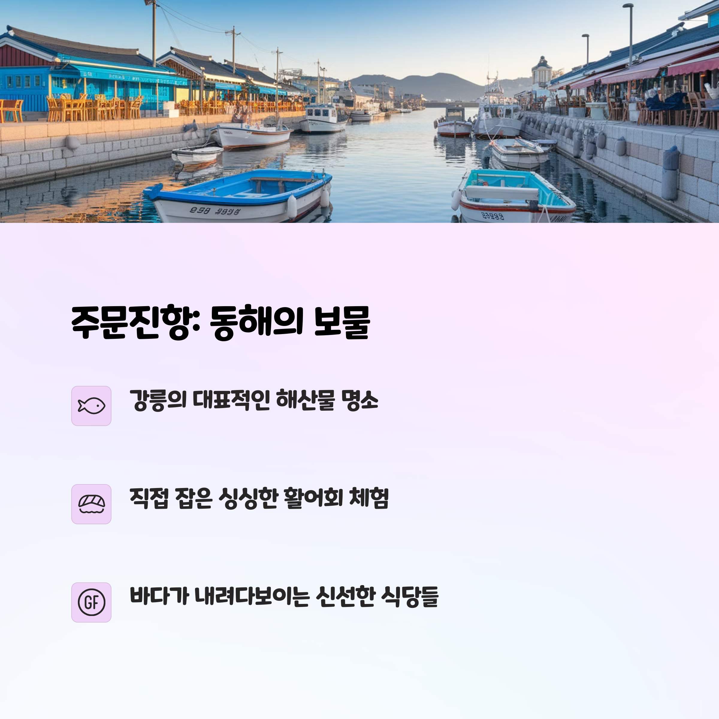 "싱싱한 해산물을 맛보기 위해 동해로 떠난다"는 말처럼, 강릉의 주문진항은 해산물 애호가들 사이에서 명실상부한 '성지'로 꼽힙니다. 이곳에서는 계절마다 다른 해산물을 만나볼 수 있는데, 봄철이면 전복과 가자미가 있고 여름에는 오징어가 풍성하게 자리합니다. 특히, 활어회가 유명한데, 어민들이 아침 조업을 마치고 활기찬 주문진항 좌판에 생선을 올려놓는 모습은 마치 영화 "리틀 포레스트"에서 자연의 풍미를 느꼈던 장면과도 같습니다.