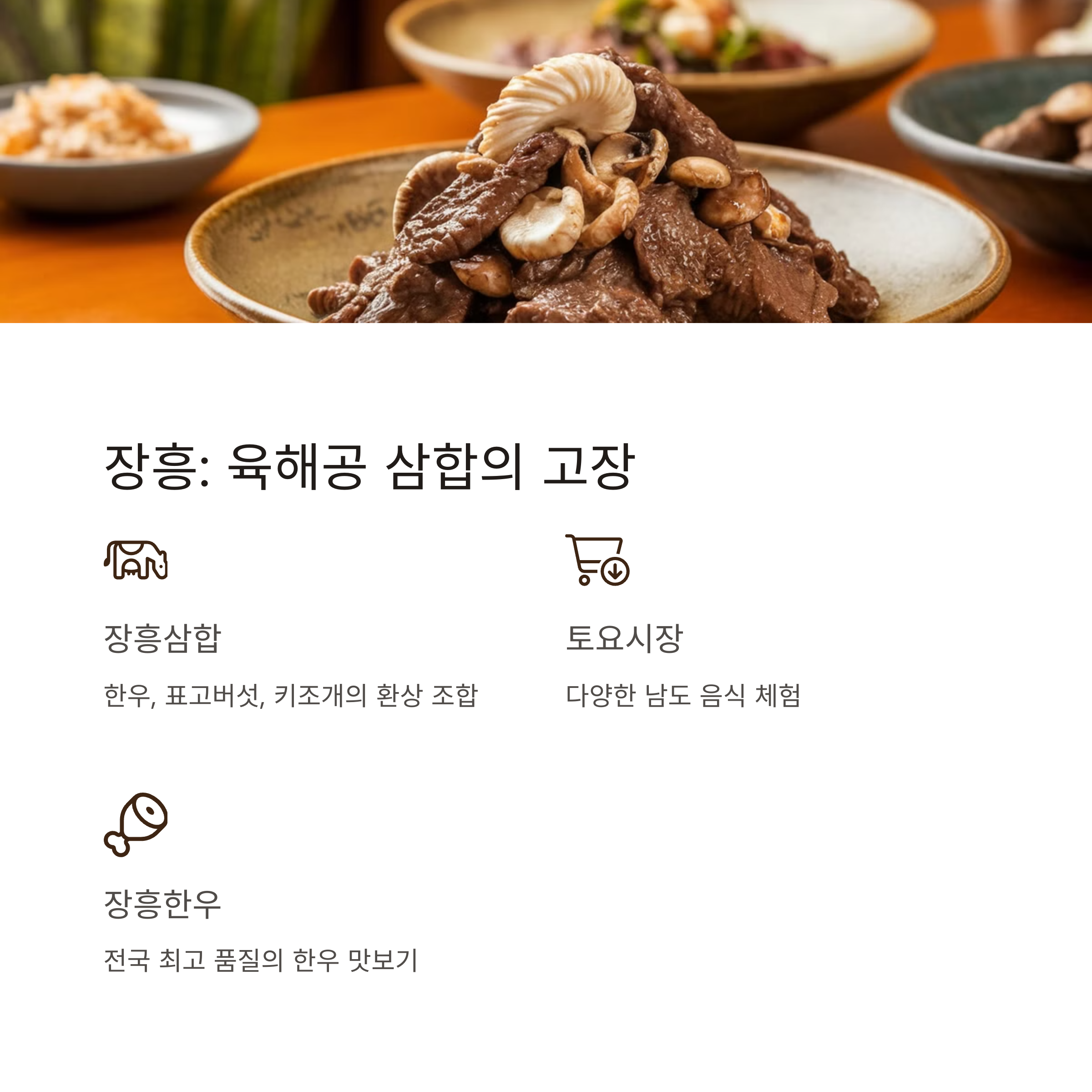 | 간장게장, 회, 매운탕, 종포수산 | 장흥삼합, 토요시장, 한우, 키조개, 표고버섯 | 청자골한정식, 회춘탕, 오감통, 푸짐한 반상 |