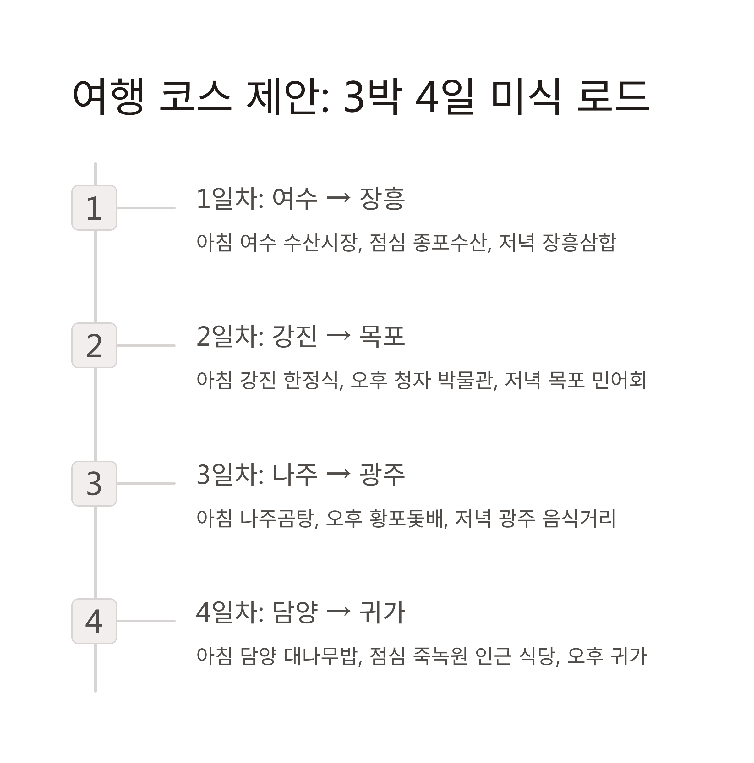 여수의 바다 회, 장흥삼합의 육즙, 강진의 고풍스런 한정식, 목포의 야성 홍어, 나주의 따뜻한 곰탕까지— 남도는 맛 그 자체, 감동 그 이상이었어요. “여행은 결국 한 끼로 기억된다”는 말처럼, 이번 미식 여행은 제 인생에 진한 맛 하나 새겼습니다. 여러분도 가볍게 떠나 보세요. 배부르고 유쾌한 힐링 여행이 남도를 기다리고 있습니다!