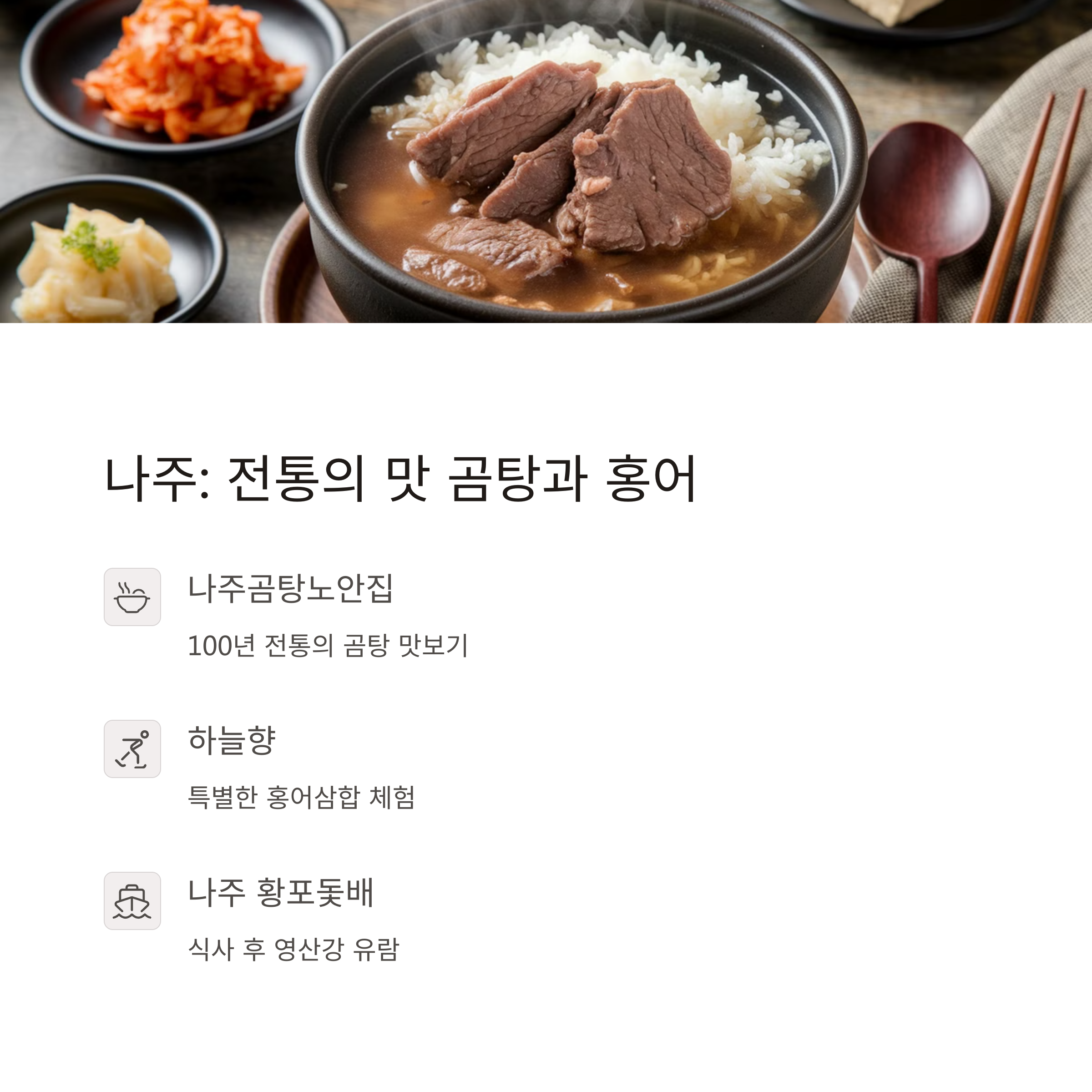나주는 "편안함"과 "도전"이 공존하는 미식 도시예요. 곰탕으로 위로받고, 홍어로 스릴을 즐겨보세요.