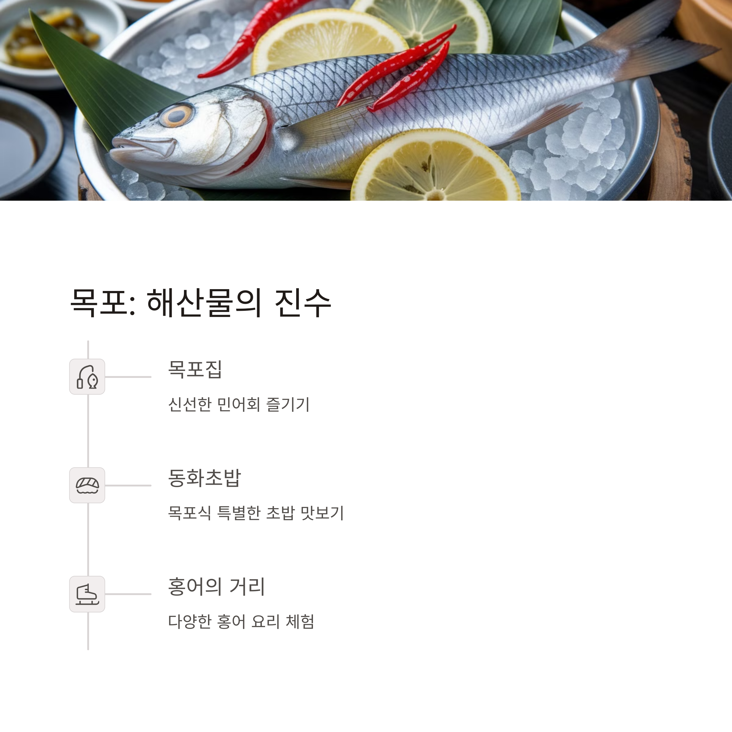 목포에서는 홍어의 "코 찌르는 맛"에 도전하고, 민어회로 "바다의 부드러움"을 느껴보세요. "홍어 냄새에 깜짝!" 놀랄 수도 있으니 코 막을 준비 하세요!