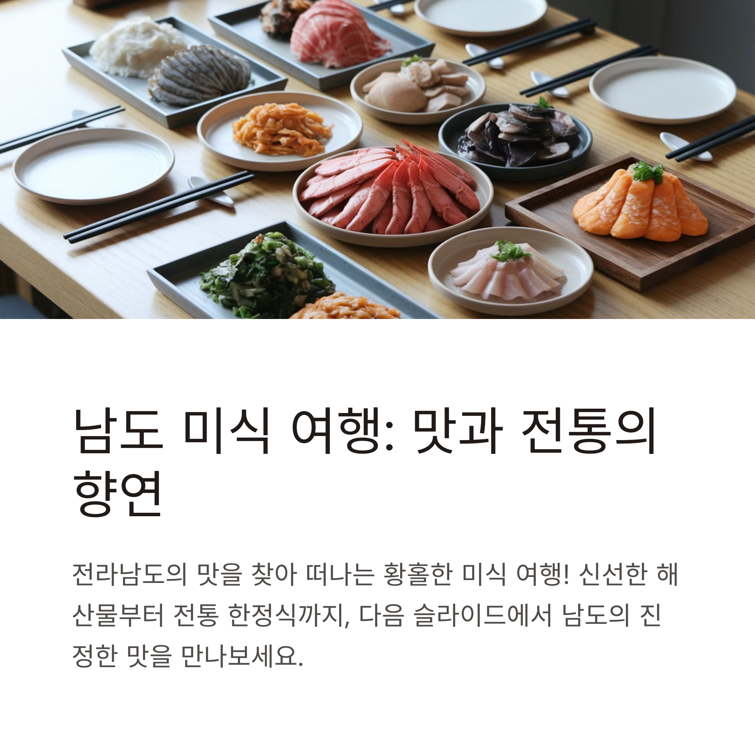 안녕하세요, 오늘은 남도 미식 로드로 여러분을 초대할게요. 여수, 장흥, 강진, 목포, 나주— 이름만 들어도 군침 돌고, 식욕이 깨어나는 도시들이죠? 해산물, 한우, 전통 한정식, 홍어까지! 남도는 한국의 보물창고, 그중에서도 '맛의 보고(寶庫)'랍니다.