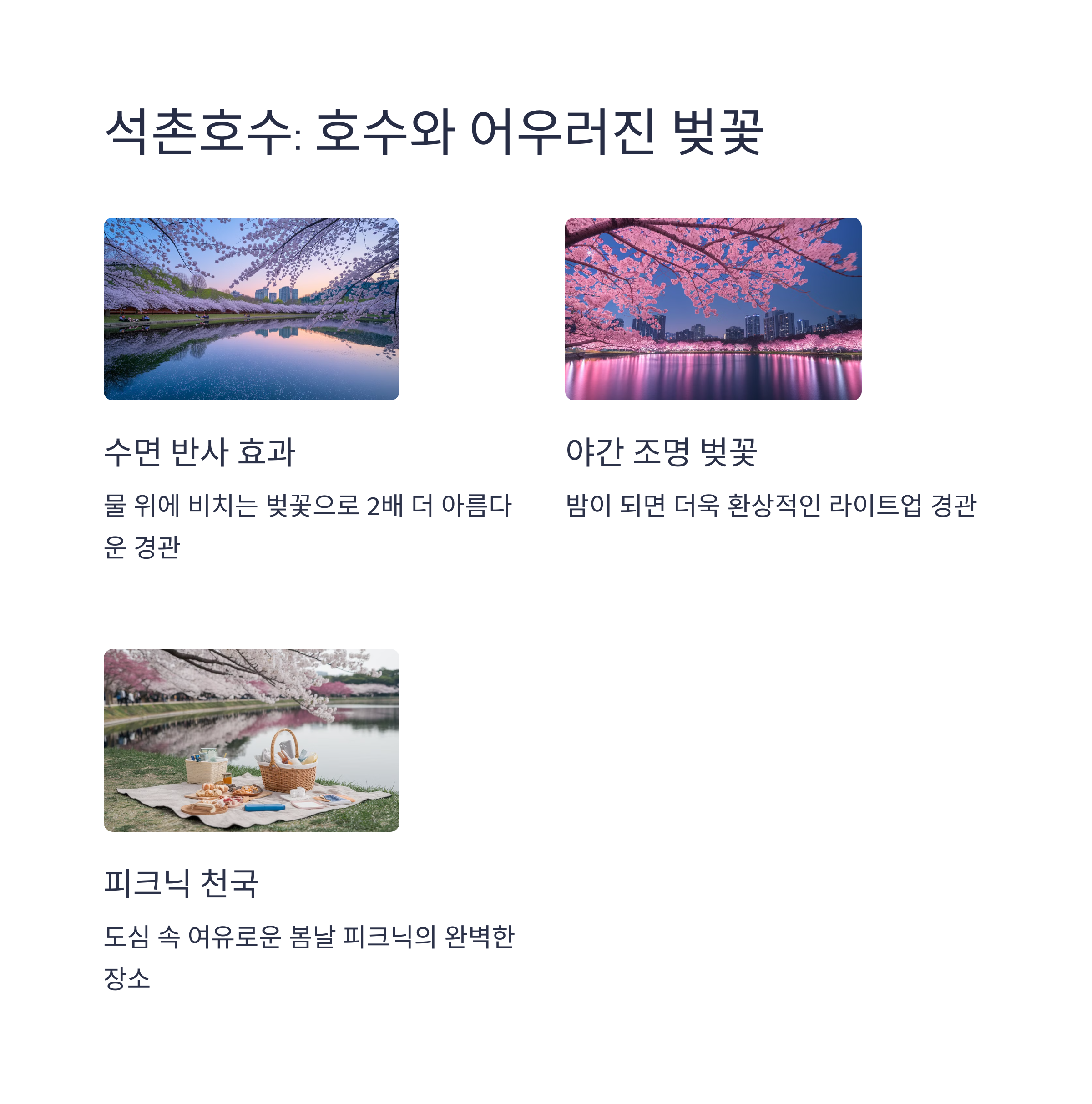 석촌호수는 서울에서 벚꽃을 보며 여유로운 산책을 즐길 수 있는 또 다른 명소입니다. 2.6km에 달하는 벚꽃길은 호수를 둘러싸고 있으며, 이곳의 벚꽃은 밤에도 조명 덕분에 환상적인 풍경을 자랑합니다. 낮에는 롯데월드 성과 함께 사진을 찍기 좋은 포토스팟을 제공하고, 밤에는 약 1,100그루의 벚나무가 조명을 받아 만든 꿈 같은 장면을 감상할 수 있습니다.