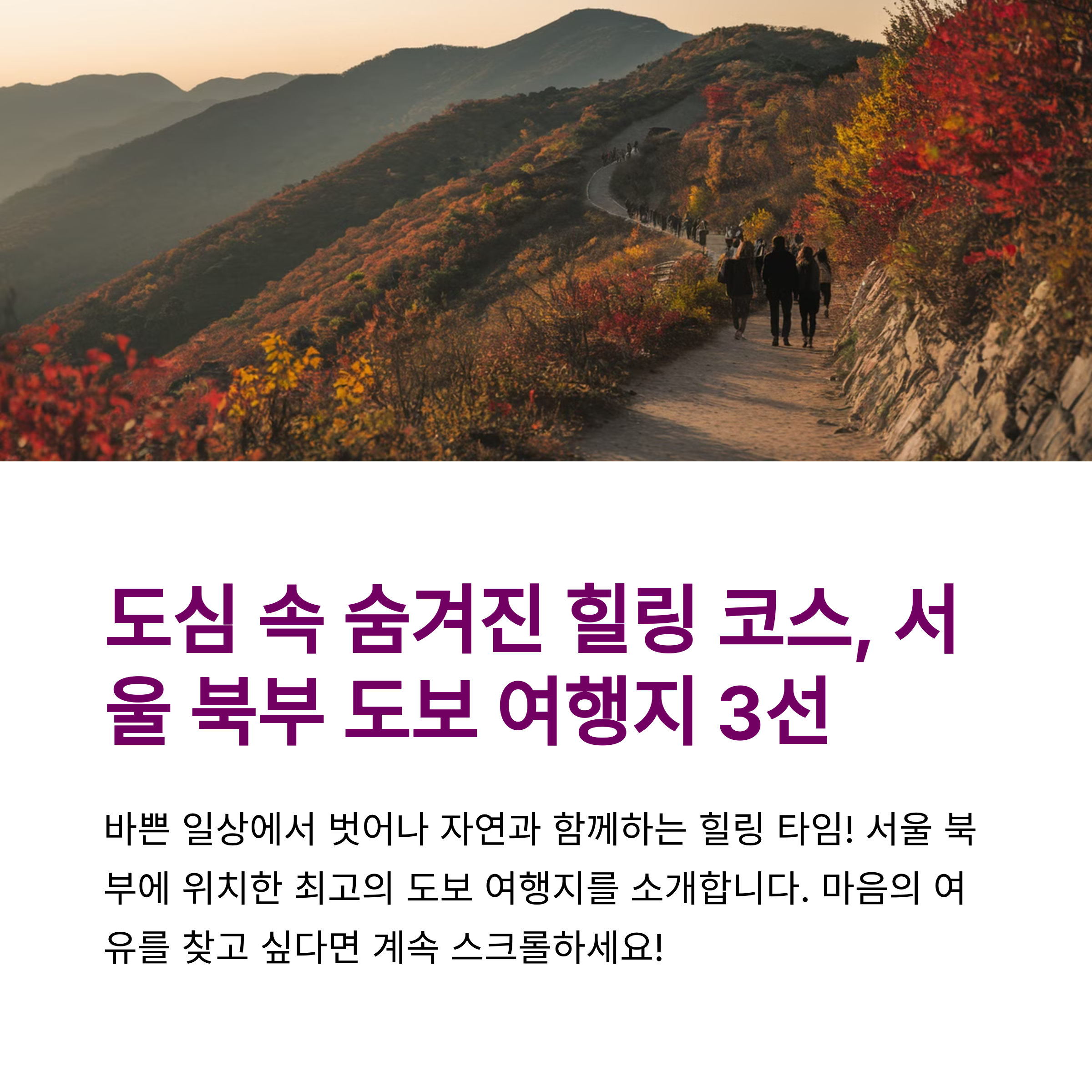 | 북한산 둘레길 | 사계절 모두 아름다운 자연 속 힐링 산책로예요. |