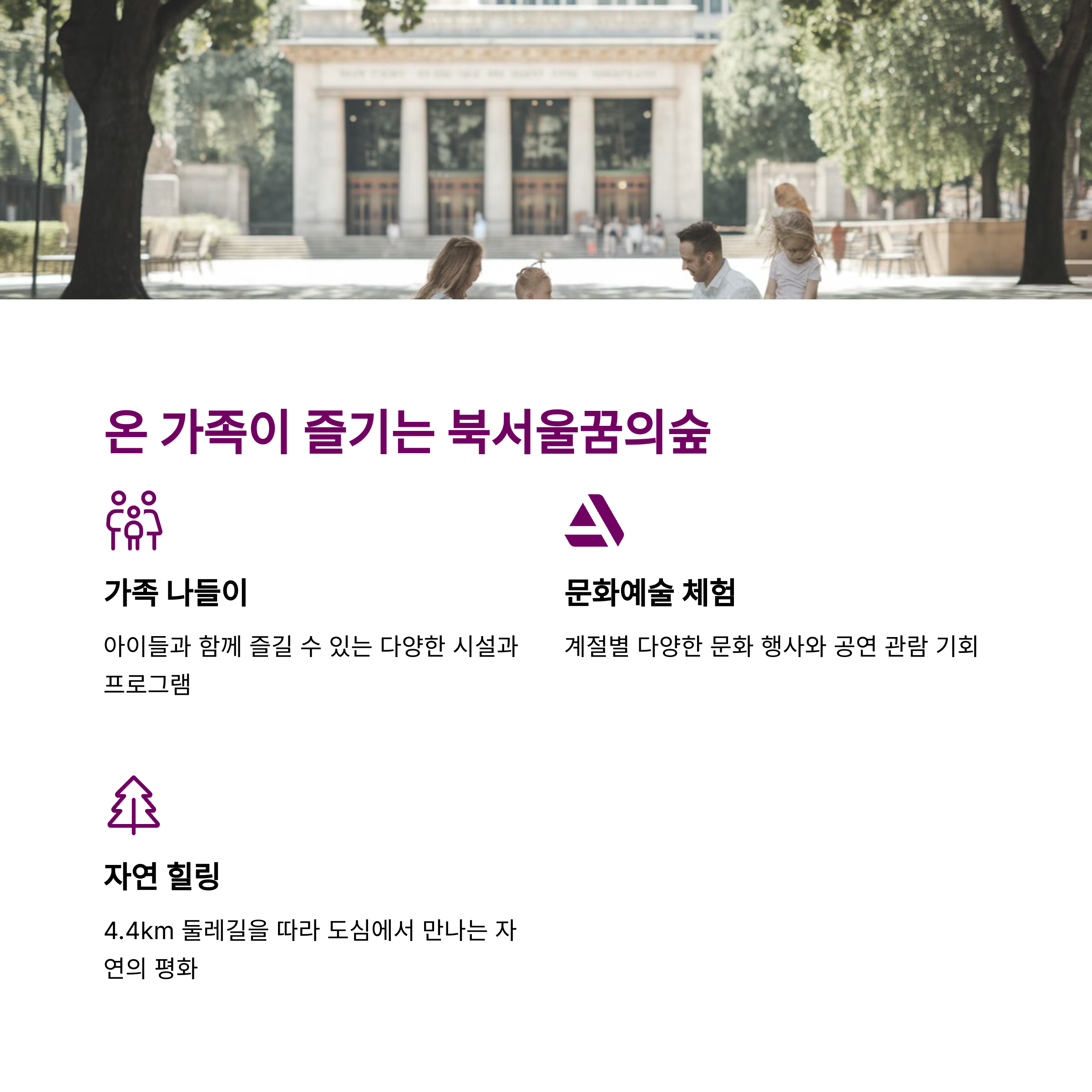 | 북서울꿈의숲 | 공원과 문화가 어우러진 도심 속 숨통 같은 공간이에요. |