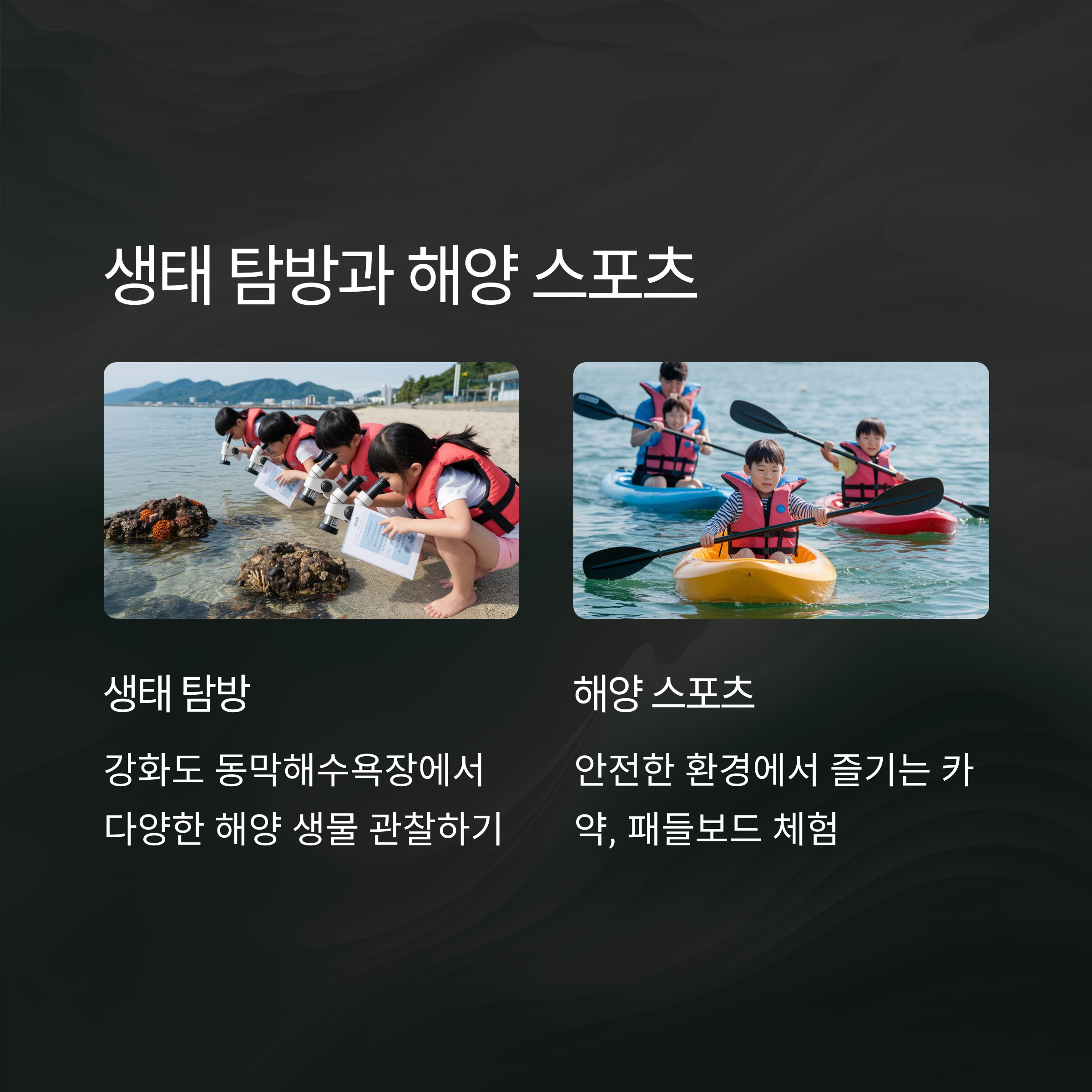 강화도 동막해수욕장도 추천할 만한 곳이에요. 해수욕은 물론 주변 생태 탐방 코스를 즐길 수 있어, 연간 15만 명 이상이 찾는 인기 명소죠(강화군 관광 통계). 아이들과 해안가를 걸으며 조개껍데기를 주우며 생태 이야기를 나누다 보면, 자연이 얼마나 다채로운지 새삼 놀라게 됩니다. 이런 체험은 아이들에게 즐거움과 깨달음을 동시에 안겨줍니다.