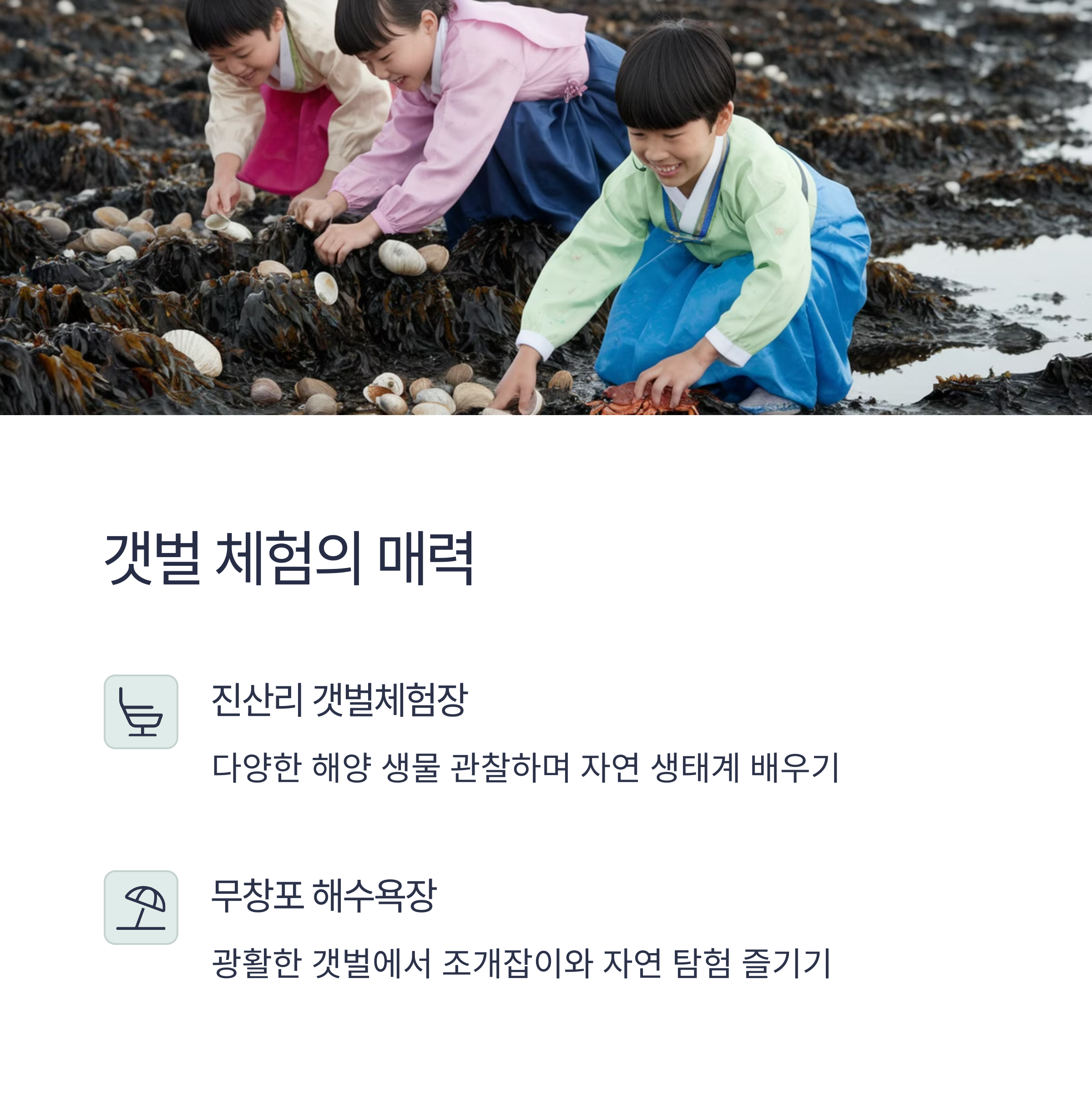 안전한 환경에서 조개잡이를 즐기고, 갯벌 생태를 설명해주는 프로그램 덕에 교육적 가치까지 더해집니다.