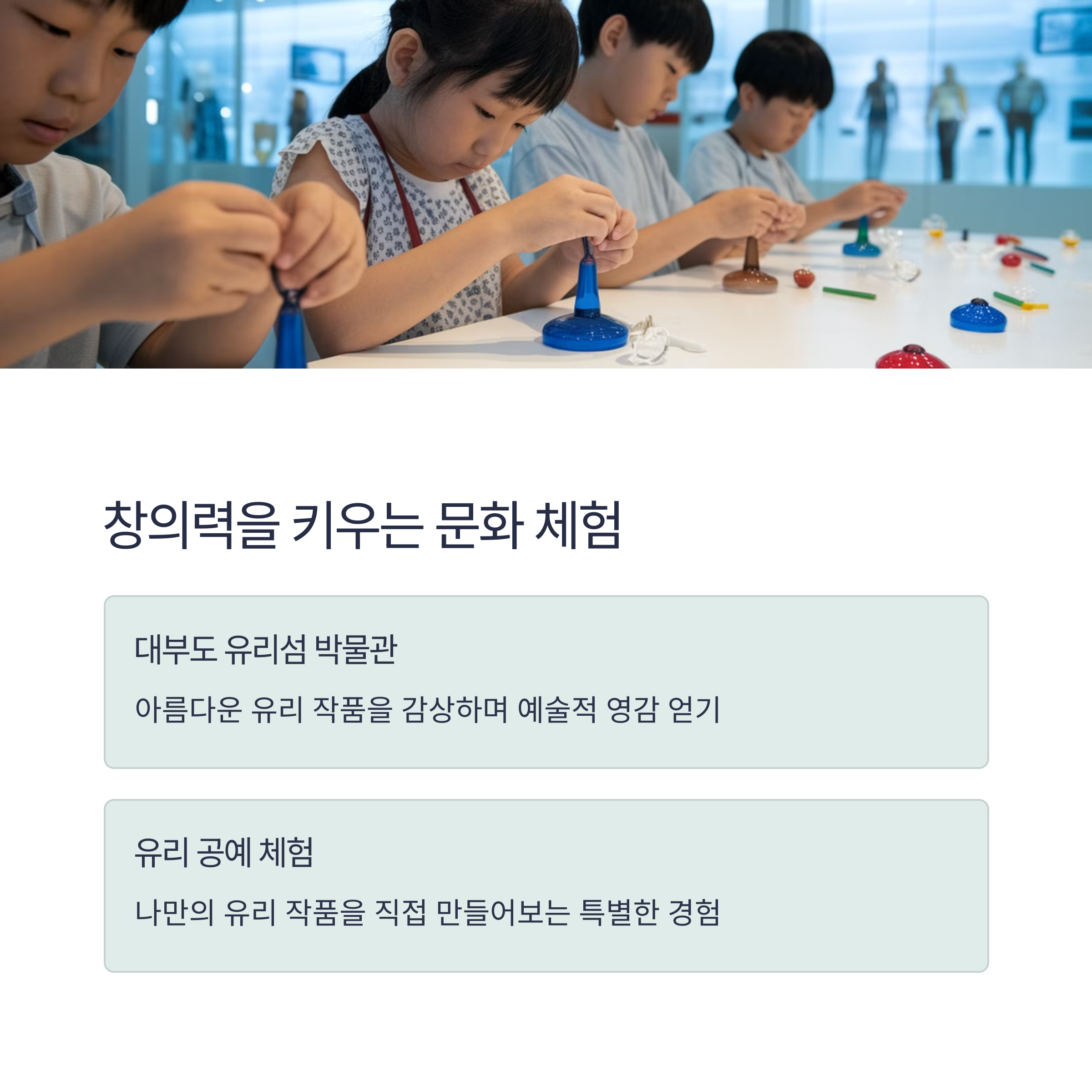 서해는 자연뿐 아니라 문화와 예술을 만끽할 기회도 풍부합니다. 대부도 유리섬 박물관은 유리공예의 세계로 아이들을 초대하는 특별한 곳이에요. 전시된 작품을 감상하는 데서 끝나는 게 아니라, 직접 유리 공예품을 만들어보며 창작의 기쁨을 누릴 수 있죠. 연간 5만 명 이상이 찾는 이곳은 가족 단위 방문객의 만족도가 높다고 해요(대부도 관광 안내소 자료). 저도 아이들과 유리 구슬 만들기에 도전해봤는데, 뜨거운 유리를 다루는 긴장감 속에서 완성된 작품을 보며 아이들이 외친 “와!” 소리가 아직도 생생합니다. 이곳은 “창의력은 경계가 없다”는 걸 아이들에게 보여줬어요.
