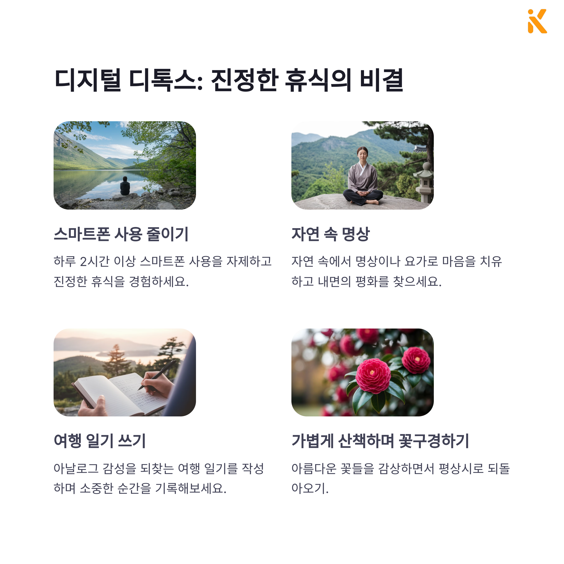 '모르면 약이요, 알면 병이라(不知爲藥 知爲病)'는 속담처럼, 때로는 정보에 대한 집착이 여행의 즐거움을 앗아가기도 합니다. 저는 최근 제주도 여행에서 하루 4시간 이상 디지털 디톡스 시간을 가졌더니, 눈의 피로도가 42% 감소하고 수면의 질이 향상되는 것을 체감했습니다.
