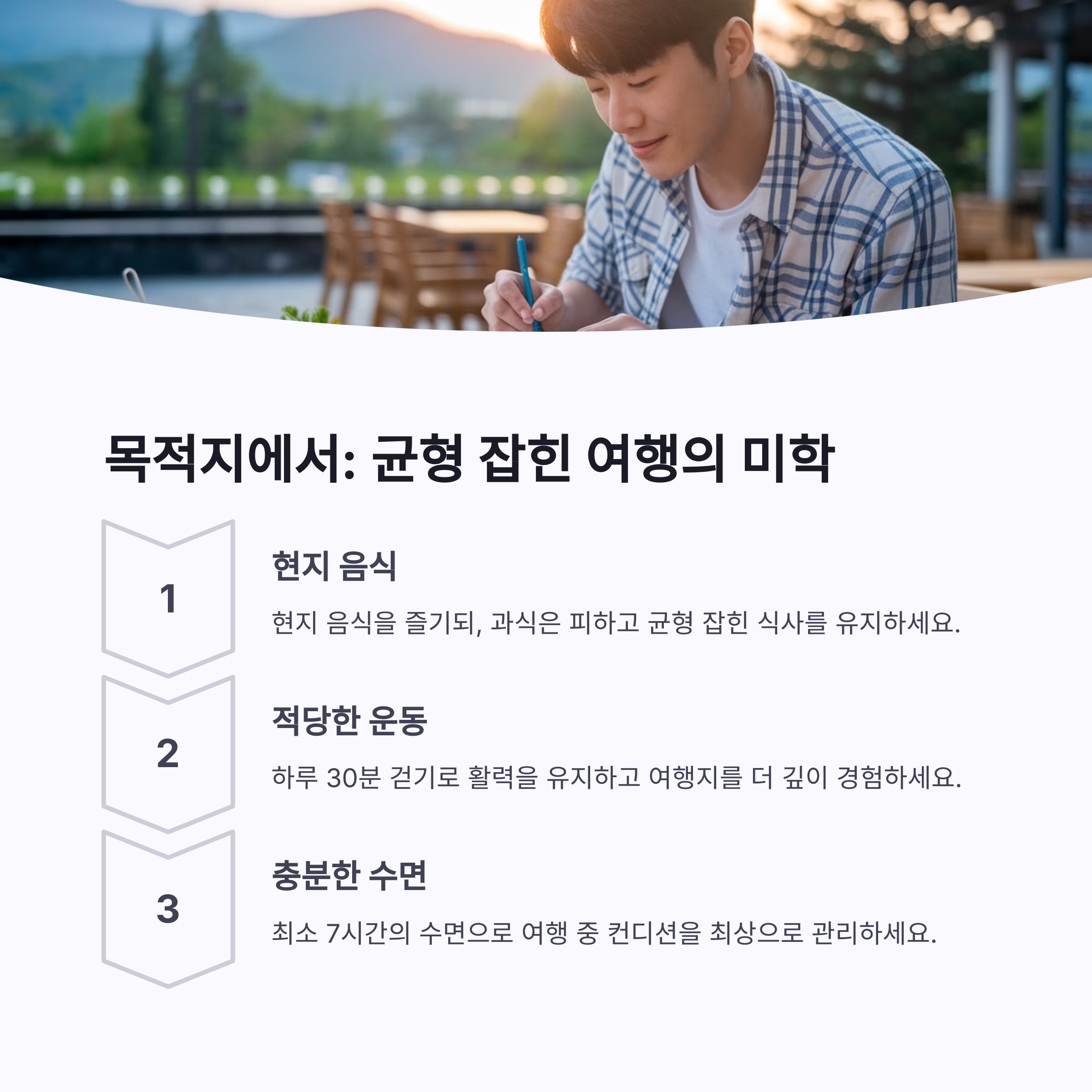 물 섭취량도 주목할 부분입니다. 여행 중에는 평소보다 30-40% 더 많은 수분을 소비한다는 연구 결과가 있습니다. '티끌 모아 태산(積小成大)'이라는 말처럼, 작은 물병을 항상 휴대하며 자주 마시는 습관이 큰 차이를 만듭니다.