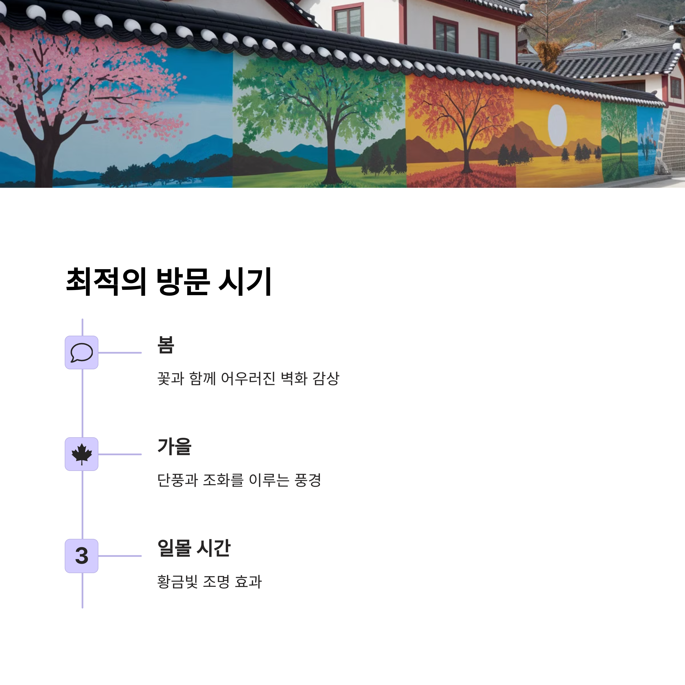 마을의 풍경과 벽화의 따뜻한 색감이 어울려, 한 장의 사진에도 평화로운 기운이 담긴다. 바쁜 일상에서 벗어나 힐링하며 카메라를 들기에 최적의 장소다. “사진은 마음의 쉼터”라는 말처럼, 이곳에서 찍은 한 컷은 일상에 지친 마음을 달래준다.
