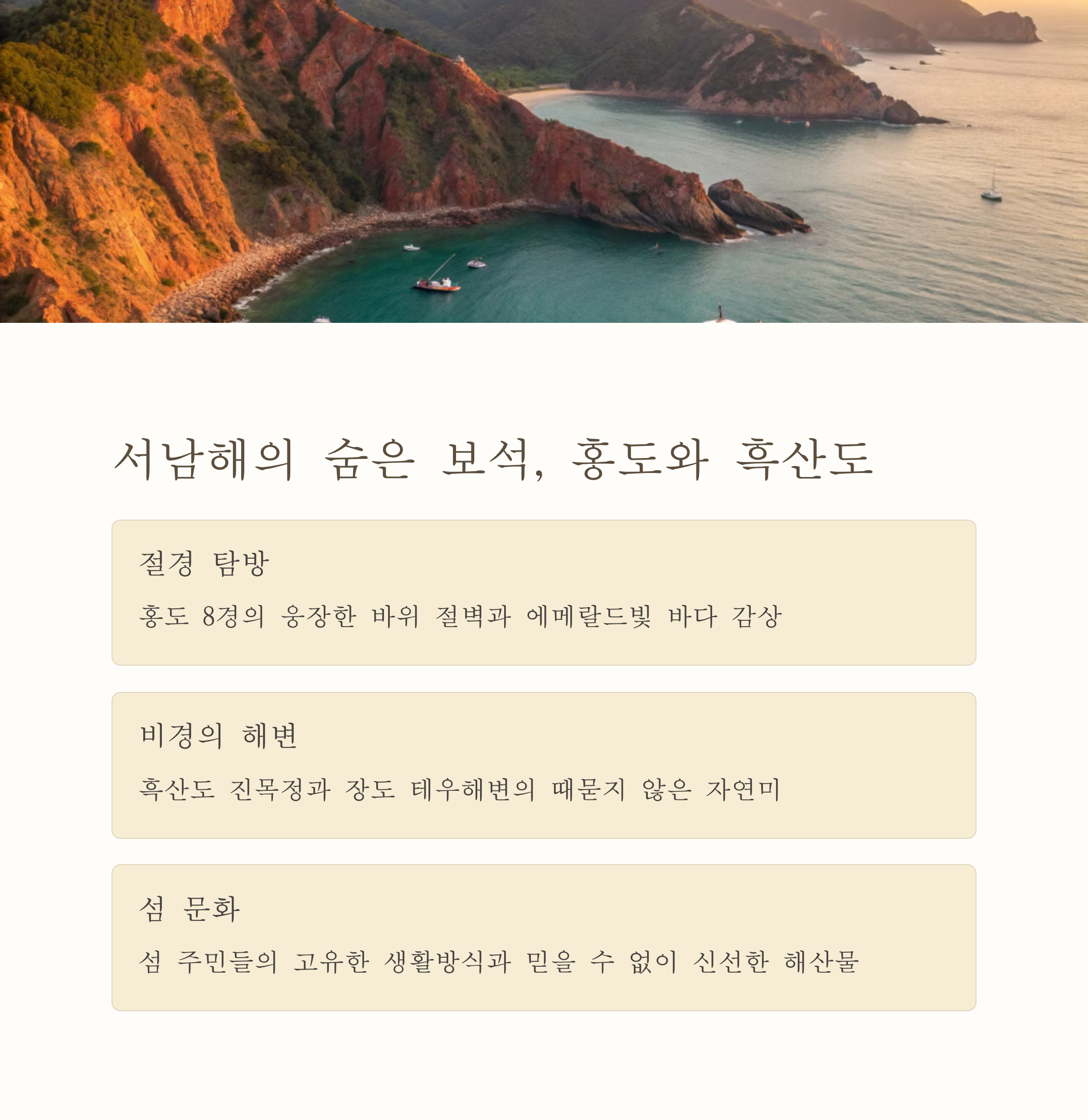 '서해의 하와이'라 불리는 홍도는 전체 면적의 약 93%가 천연기념물로 지정된 곳입니다. 2022년 기준 연간 방문객은 약 7만 명으로, 이는 인구 밀집 관광지의 1/10 수준입니다. 홍도의 가장 높은 봉우리인 깃대봉(336m)에서 바라보는 해안선은 마치 한 폭의 동양화를 보는 듯합니다.