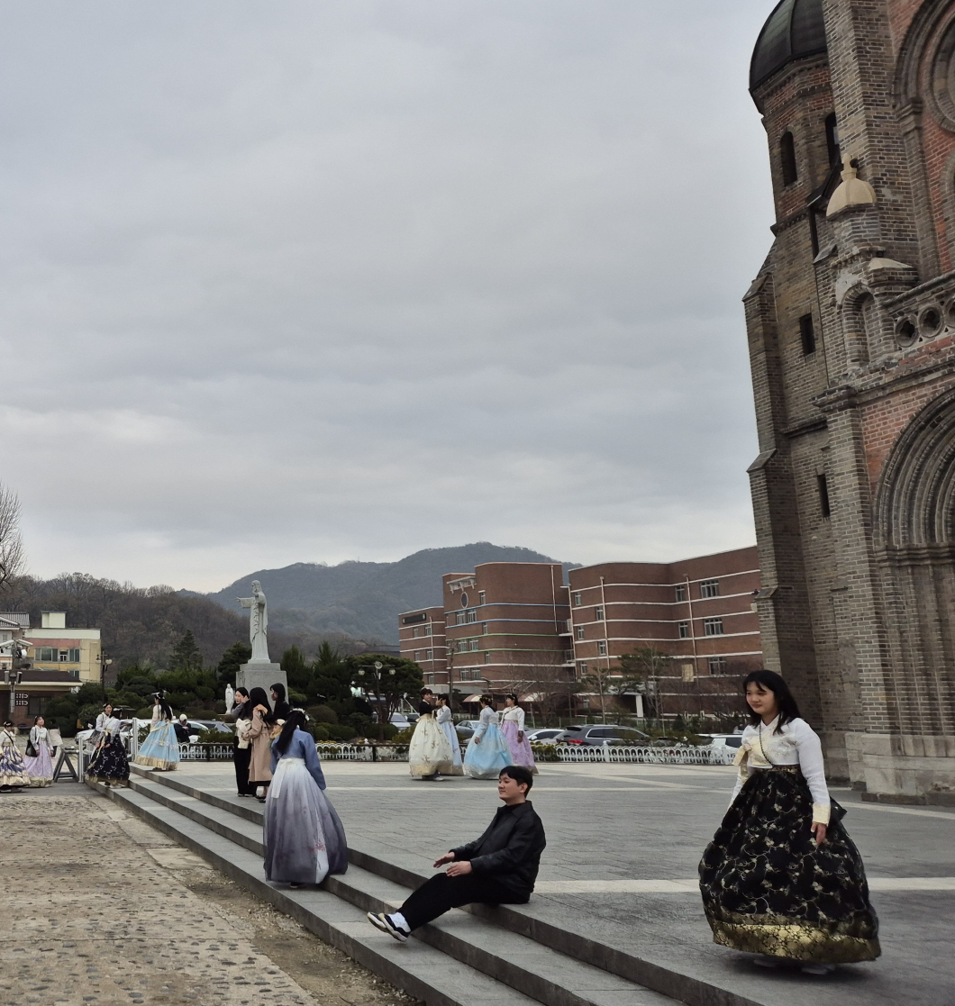 한복을 입고 전동성당 앞에서 찍으면 한국과 서양이 어우러진 독특한 분위기의 사진을 남길 수 있다.
