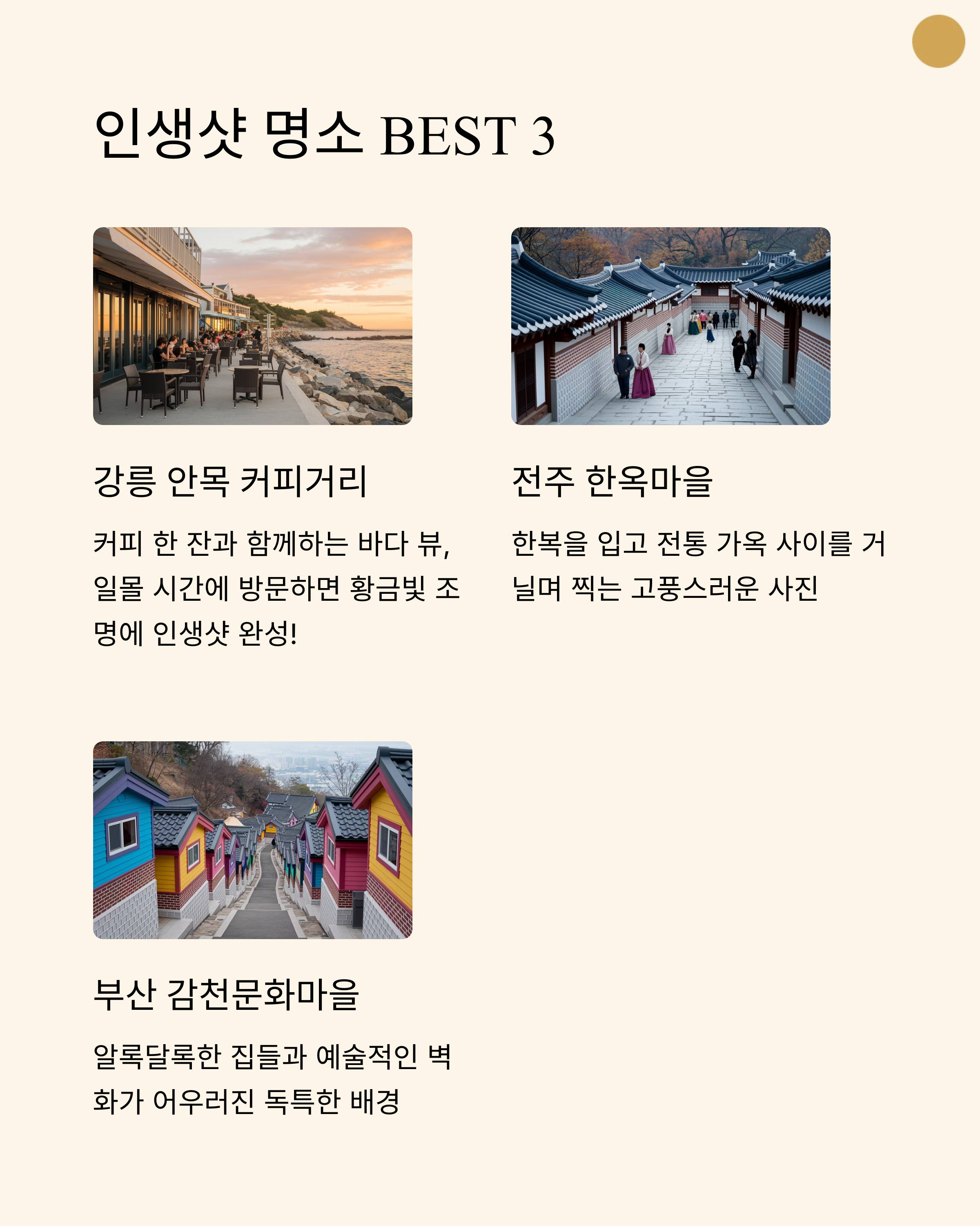 | 해변, 커피거리, 문화체험이 어우러진 감성 여행지 | 한복 체험과 전통 음식으로 타임슬립 가능 | 바다, 도시, 시장 먹거리까지 골고루 즐기는 코스 |