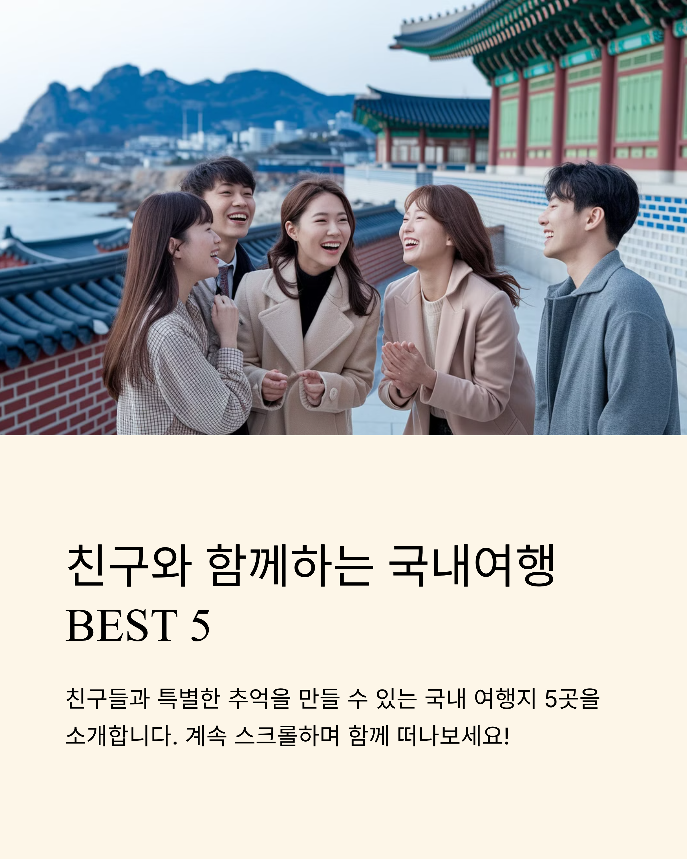 안녕하세요, 여행 꿈나무 여러분! 오늘은 친구들과 함께 가면 웃음과 추억이 폭발하는 국내 여행지 BEST 5를 소개해드릴게요. 단순한 장소 소개가 아니라, 마치 제가 직접 다녀온 듯 생생하고 유쾌한 이야기로 꽉! 꽉! 채웠답니다. 읽다 보면 "와, 이건 진짜 가야 해!" 하며 짐 싸는 자신을 발견하게 될지도 몰라요. 저도 쓰면서 여행 욕구가 터졌거든요. 해변, 전통, 도시, 자연, 먹거리까지 골고루 갖춘 다섯 곳을 위트 있게 풀어보았으니 커피 한 잔 들고 가벼운 마음으로 함께 떠나보아요! (안전벨트는 필요 없어요. 마음만 준비되면 OK!)