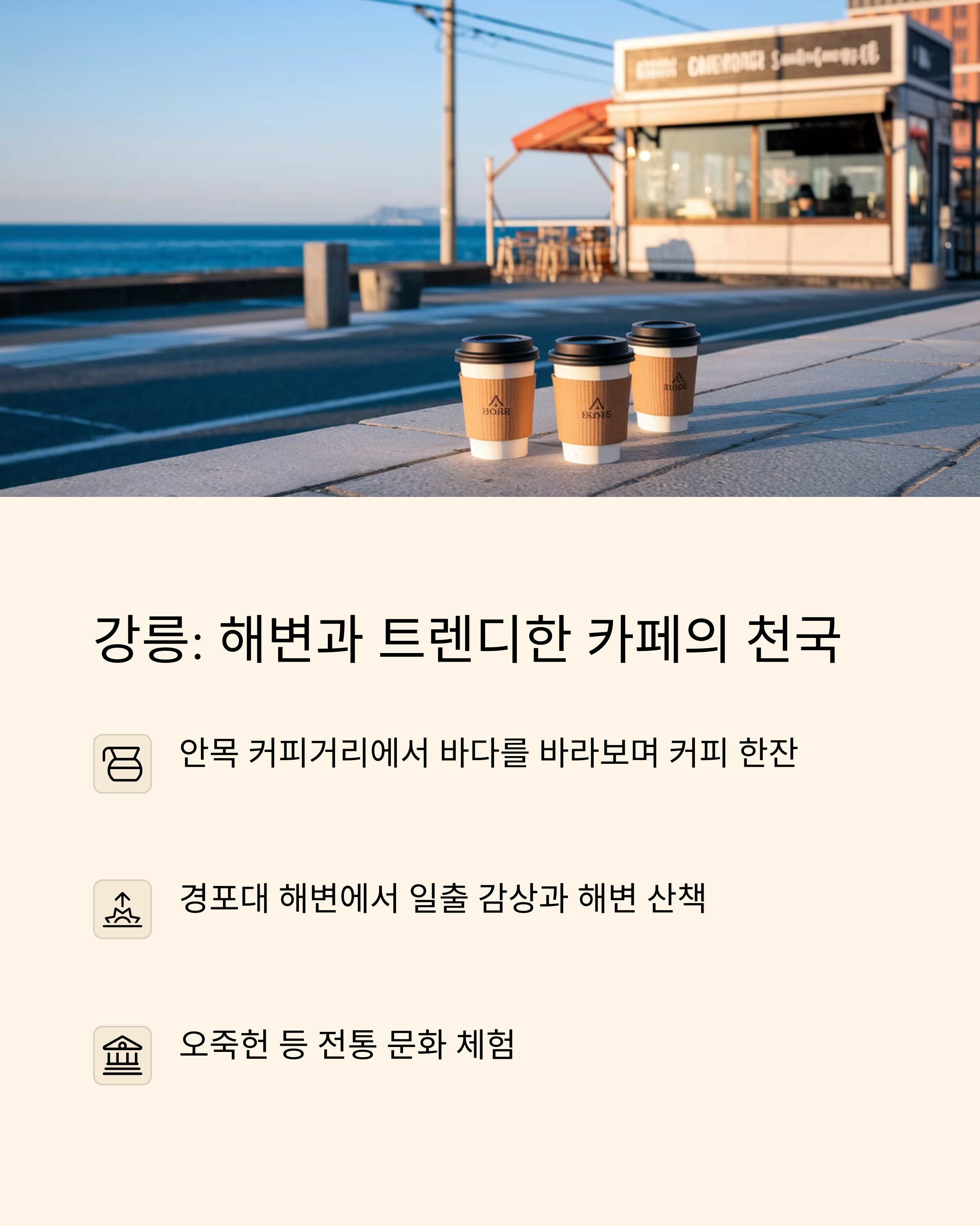 강릉은 왜 친구 여행지 1순위일까?강릉은 동해안의 숨은 보석이에요. 해변에서 물놀이하고, 카페에서 수다 떨고, 문화 체험까지! 친구들과 갔을 때 “여기 진짜 천국이다!”를 외치게 되는 곳이죠.