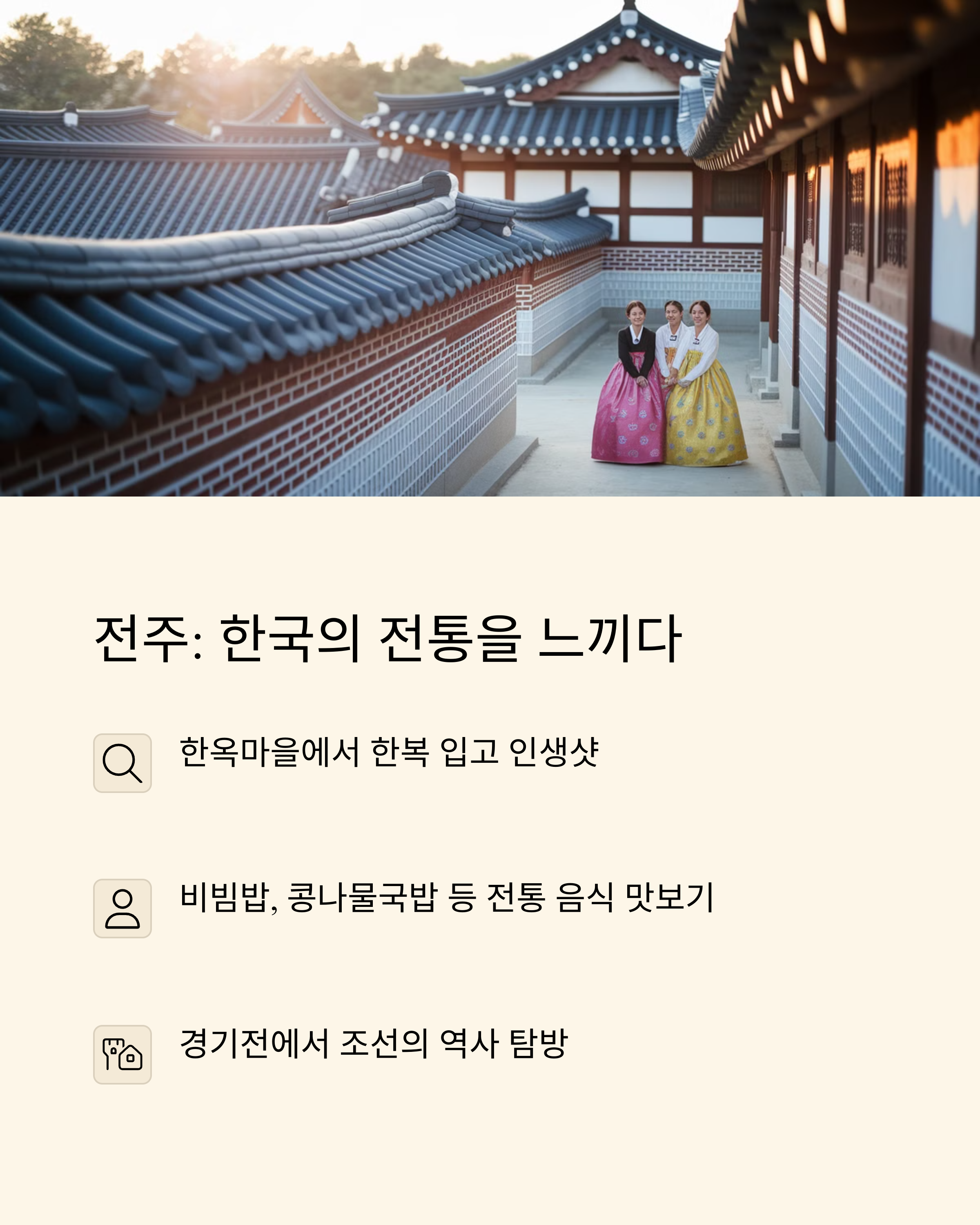 전주는 전통과 맛집 탐방으로 친구들과 “여기 또 와야지!” 하게 되는 곳이에요. 한복 사진은 아직도 제 폰 배경화면이에요!